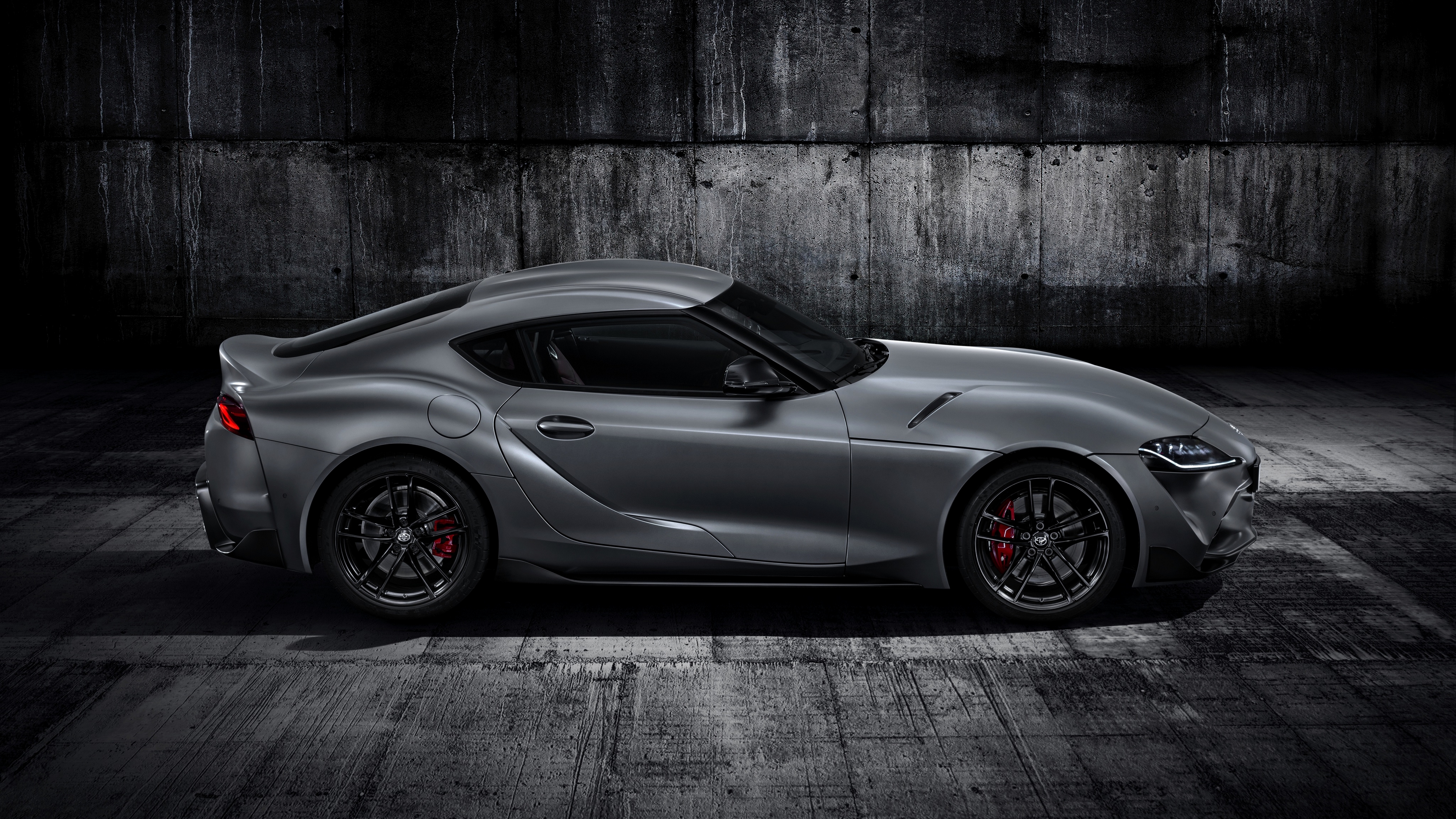Description: A silver sports car parked in a dark room with a concrete wall behind it and a black floor and a black background.