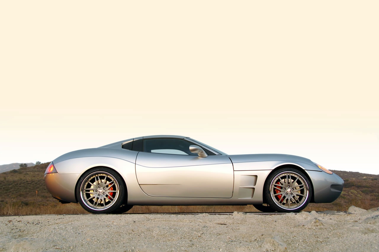 Description: A silver sports car parked on a dirt road near a hill side area with a sky background and a few clouds.