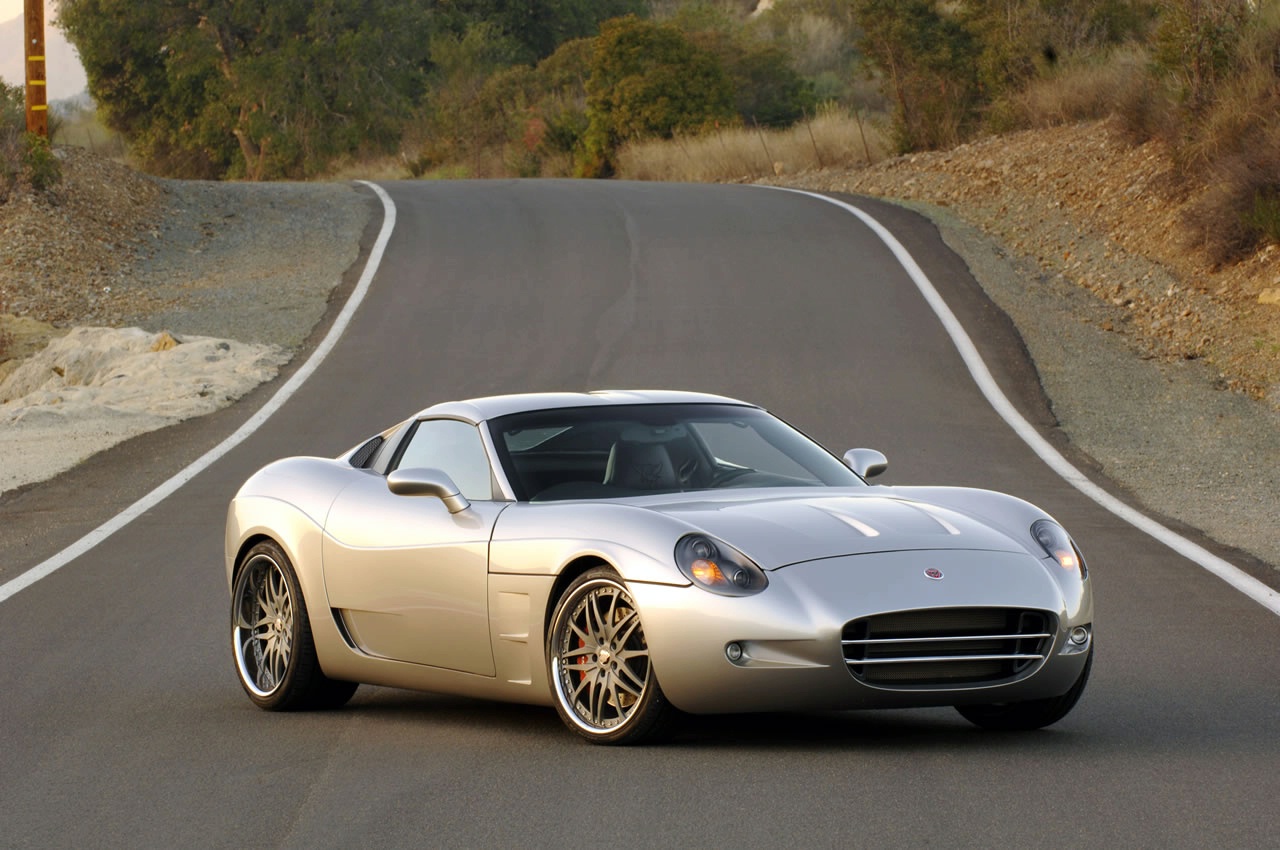Description: A silver sports car driving down a road next to a forest and a hill side road with a sign.