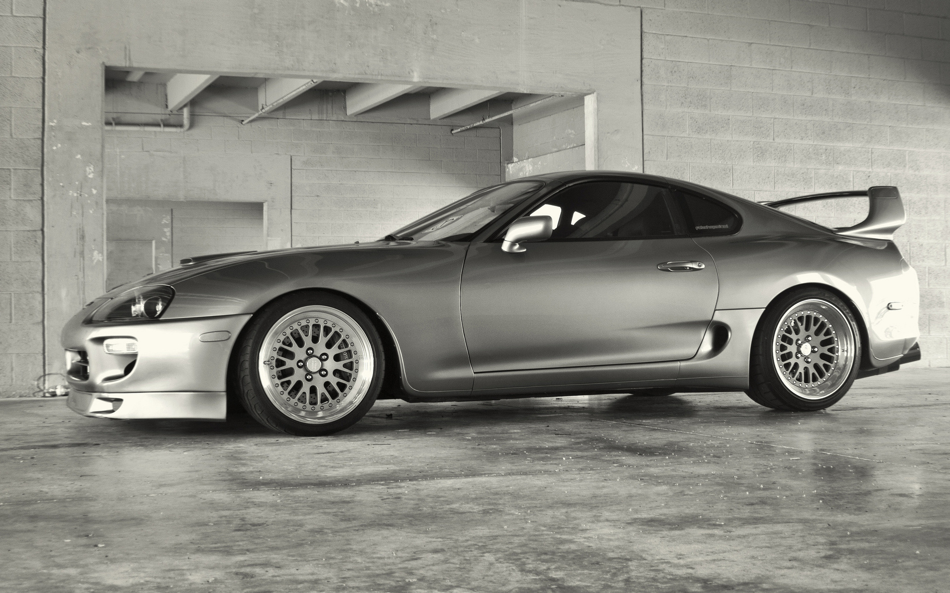 Description: A silver sports car parked in a garage next to a wall with a door open and a window open.