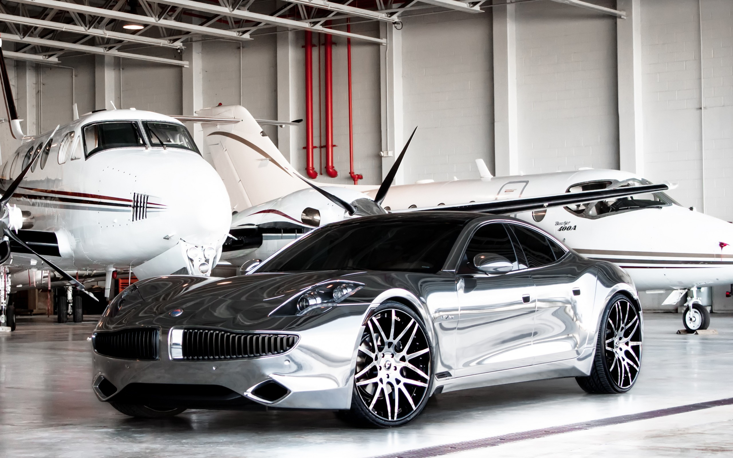 Description: A silver sports car parked in a garage next to a jet airplane and a plane on the ground in front of it.
