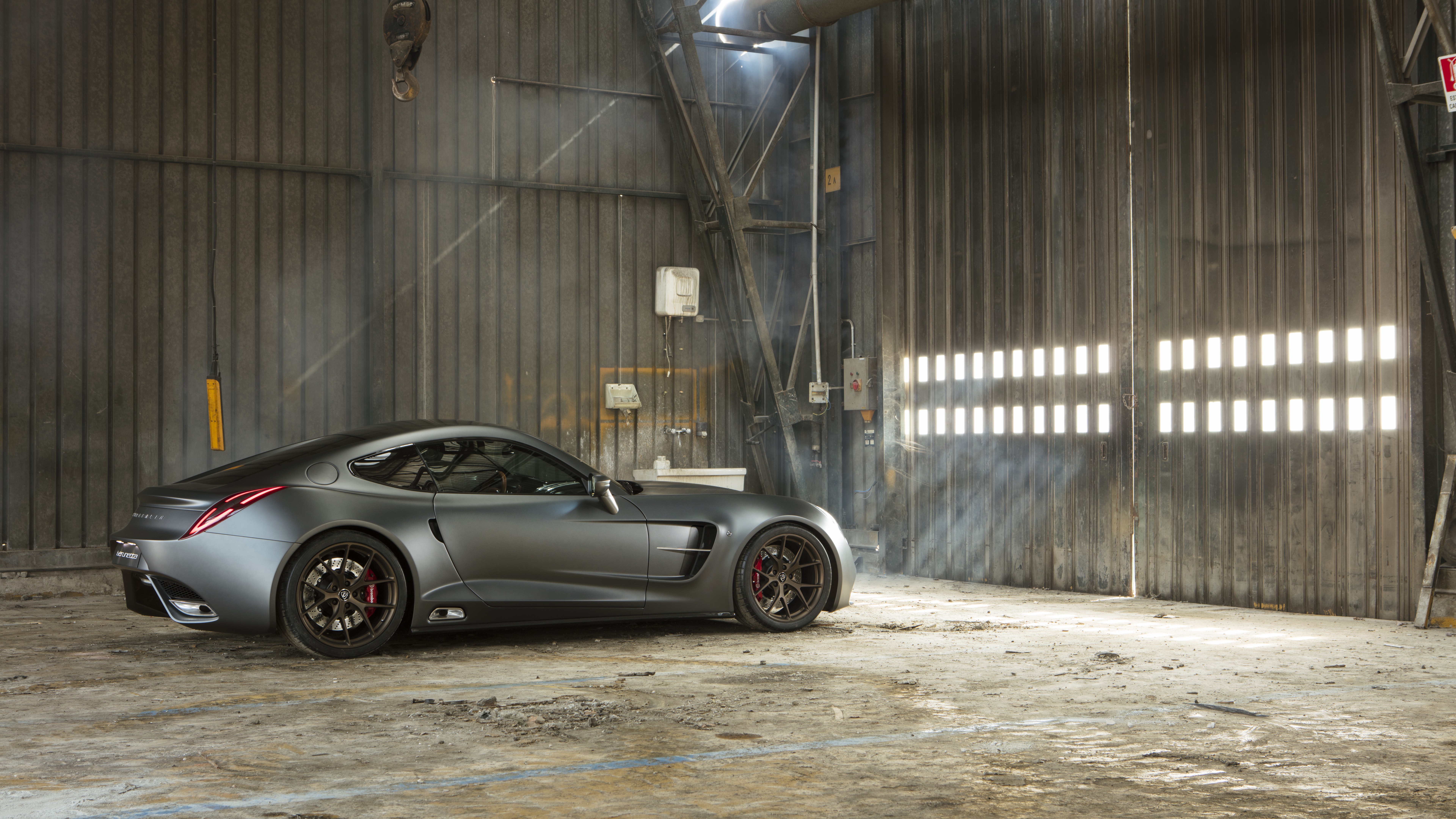 Description: A silver sports car parked in a garage with a metal wall behind it and a light shining on the floor.
