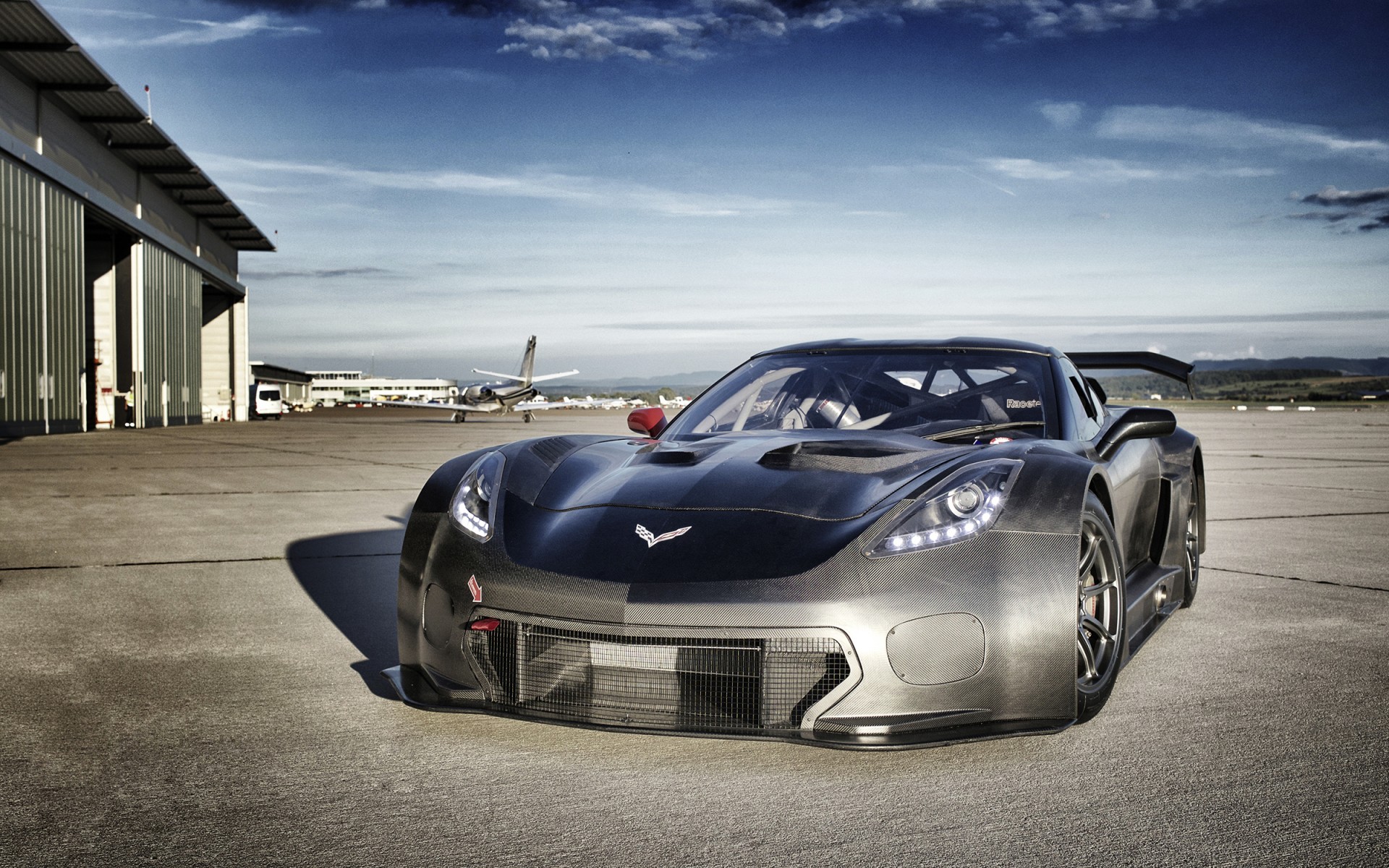 Description: A silver sports car parked in front of a hangar with a plane in the background and a building with a hangar.