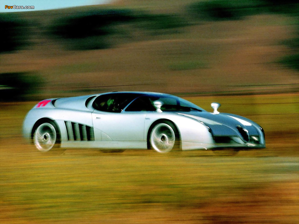Description: A silver sports car driving on a road in the grass and trees in the background.