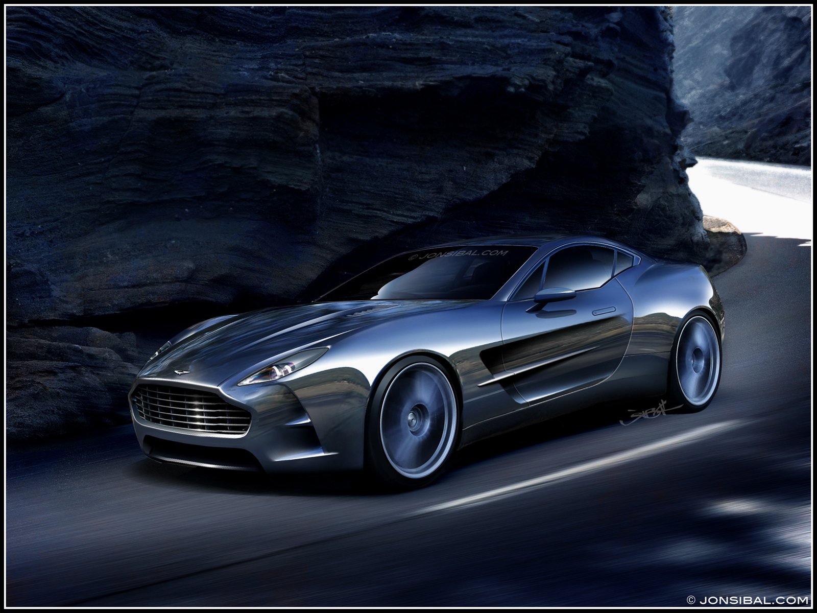 Description: A silver sports car driving down a road next to a mountain side cliff with a dark sky in the background.