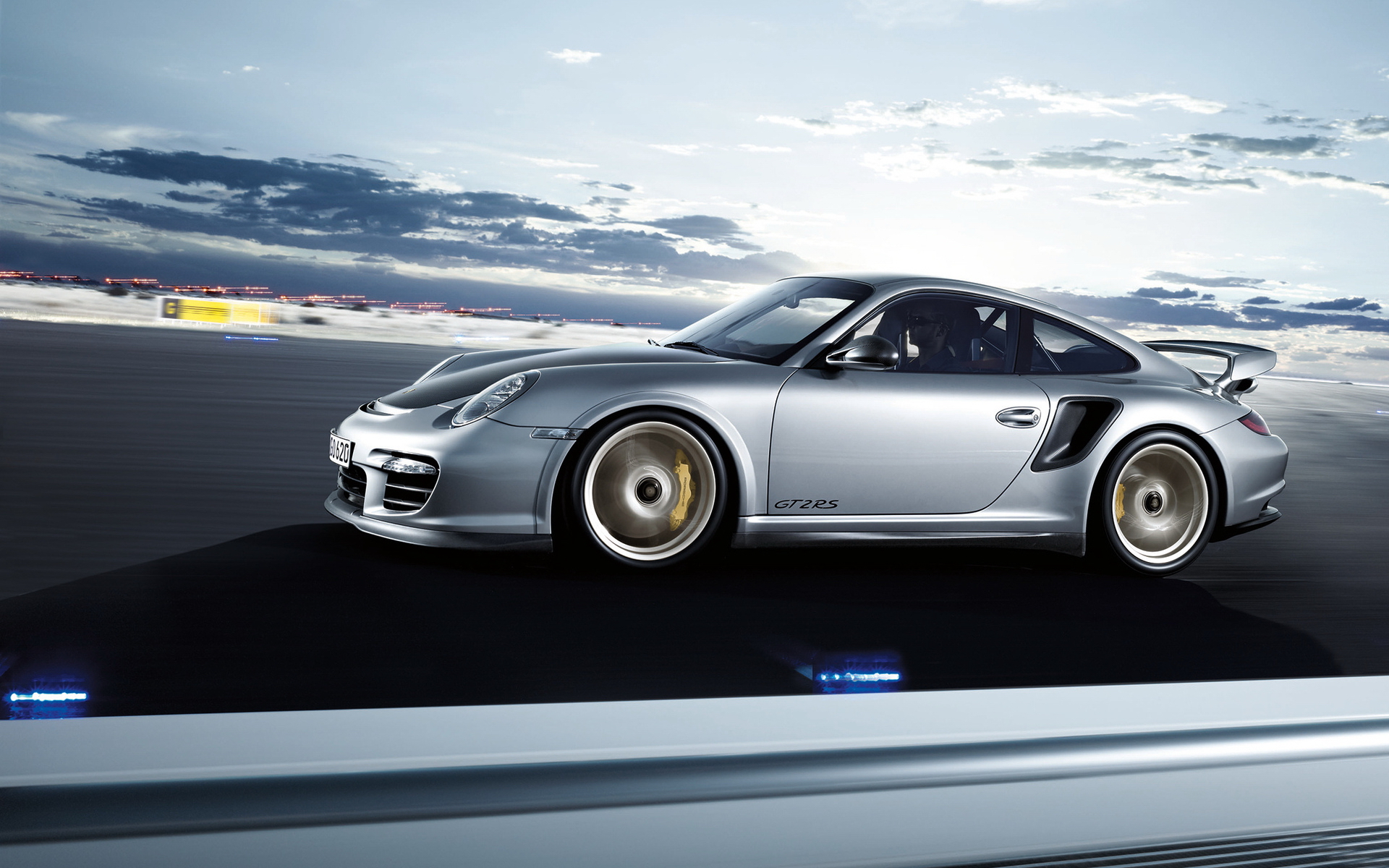 Description: A silver sports car driving down a road at night time with a sky background and clouds in the background.