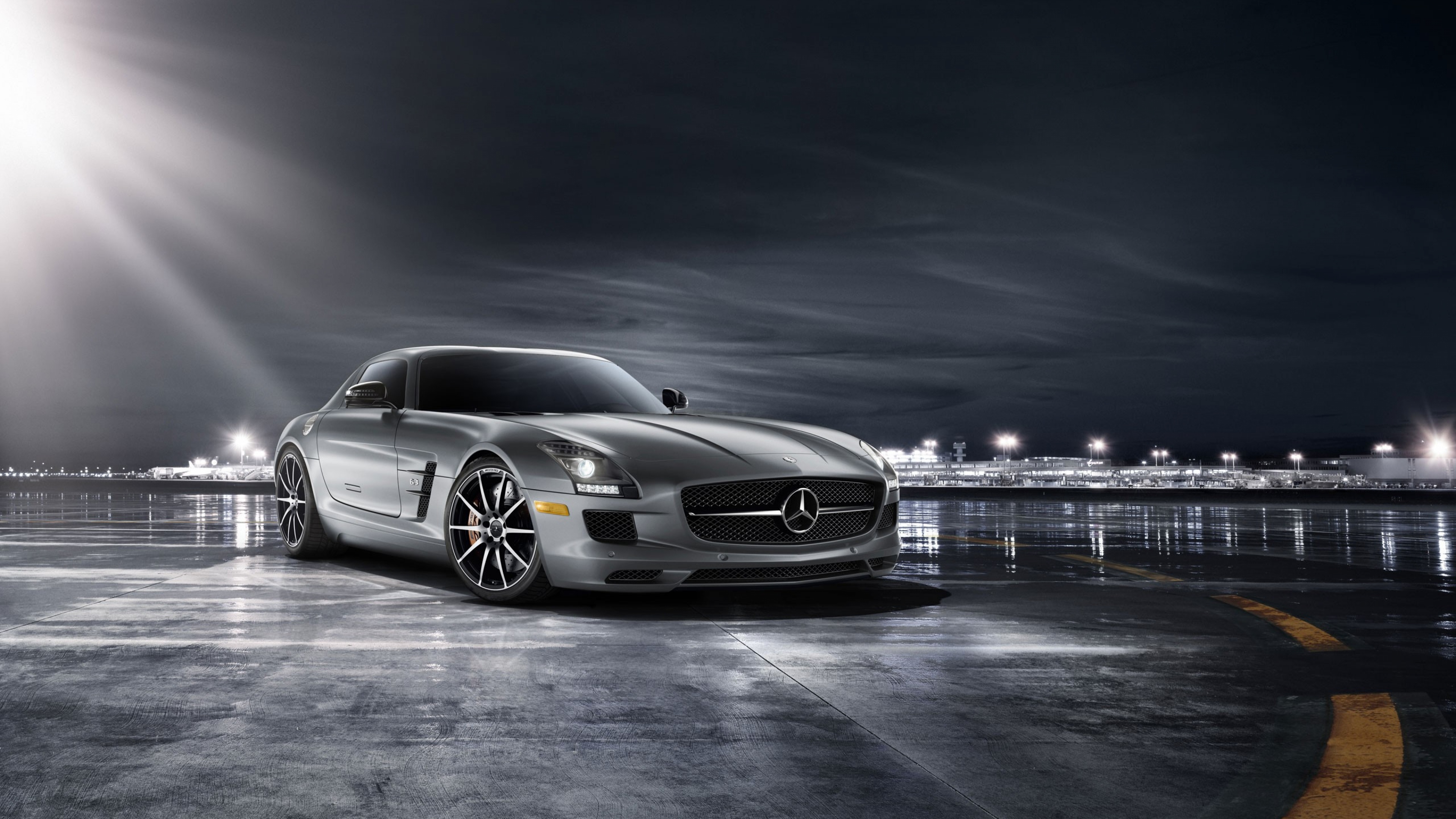 Description: A silver sports car parked in a parking lot at night with a bright light shining on the car and the water.