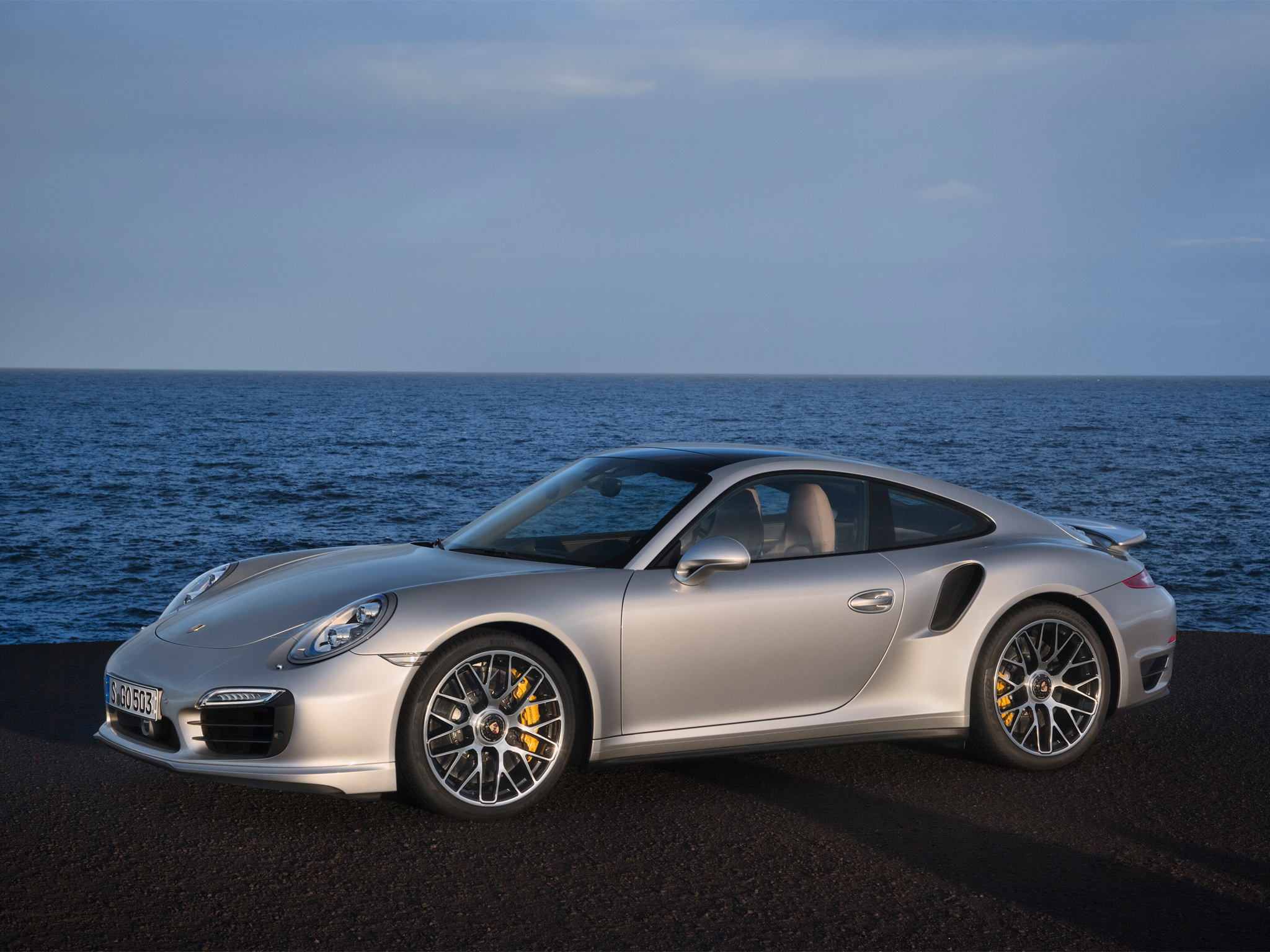 Description: A silver sports car parked on the side of the road near the ocean with a sky background and a body of water.