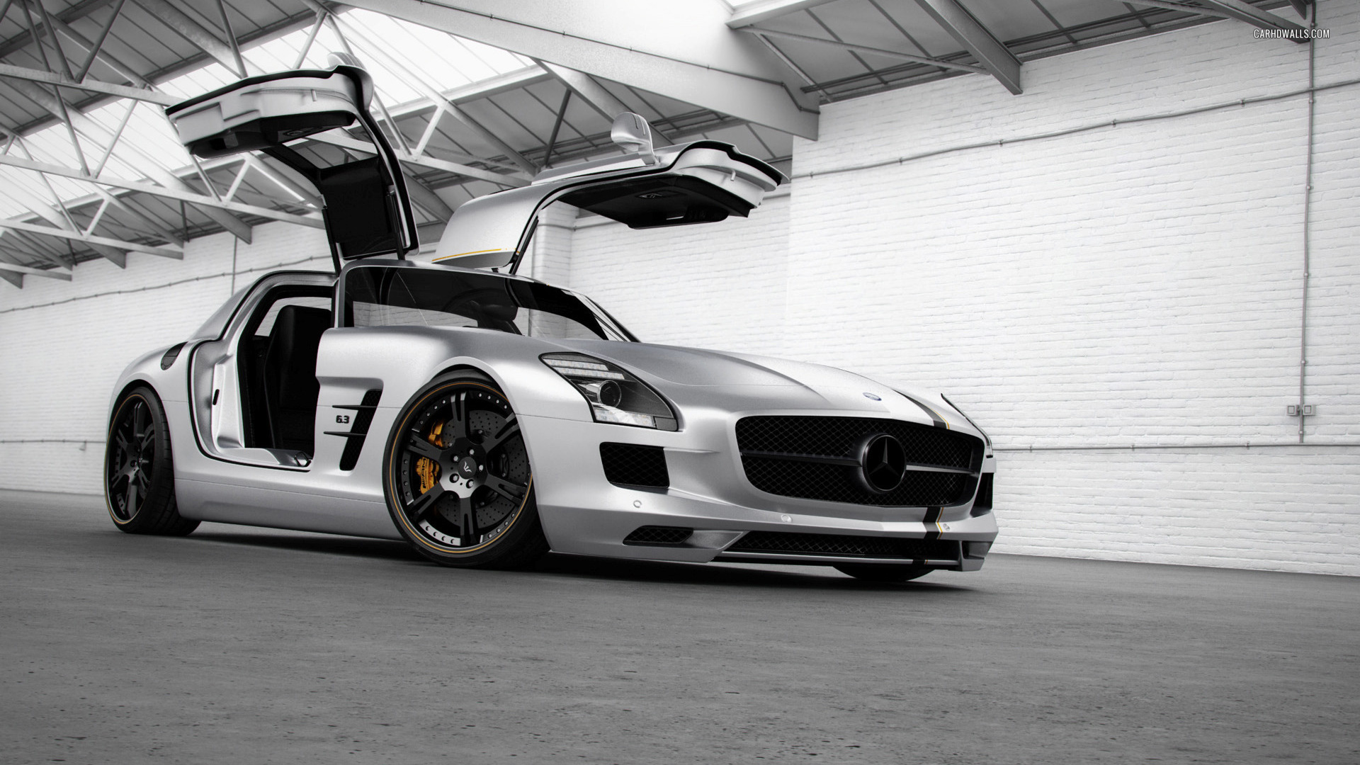 Description: A silver sports car parked in a garage with its doors open and the door open to the car is empty.