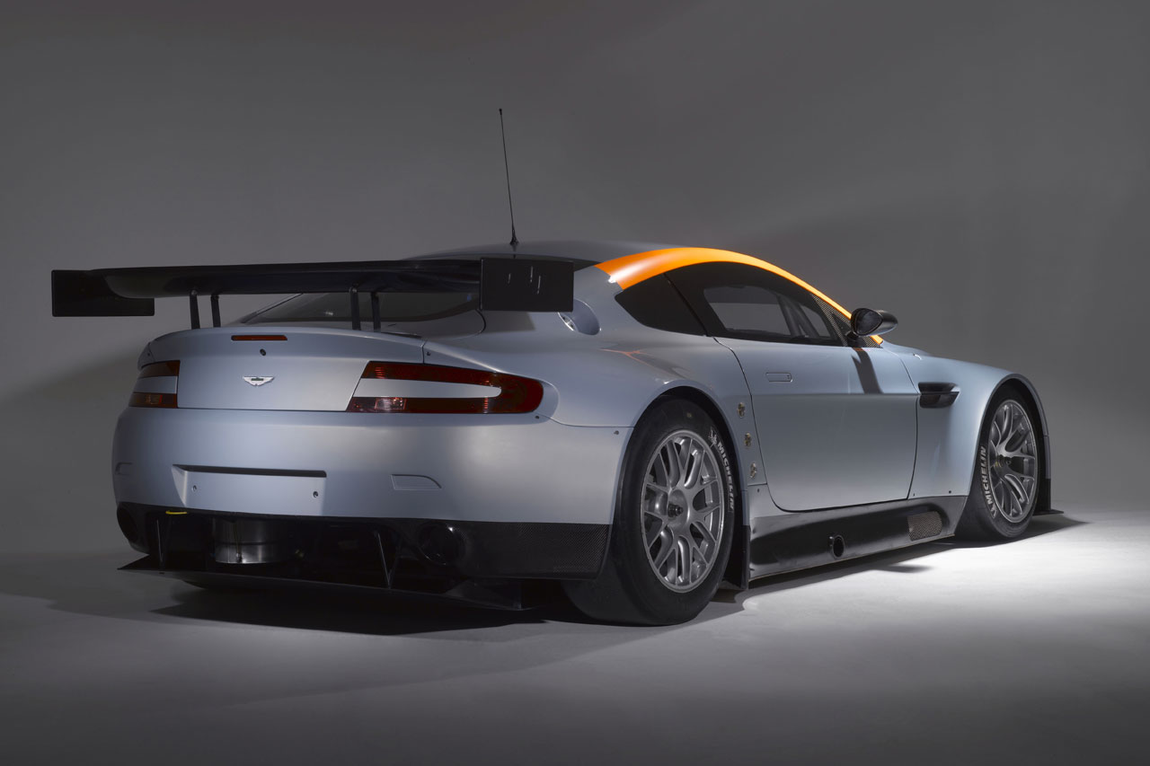 Description: A silver sports car with an orange stripe on the back of it's hood and tail lights on.