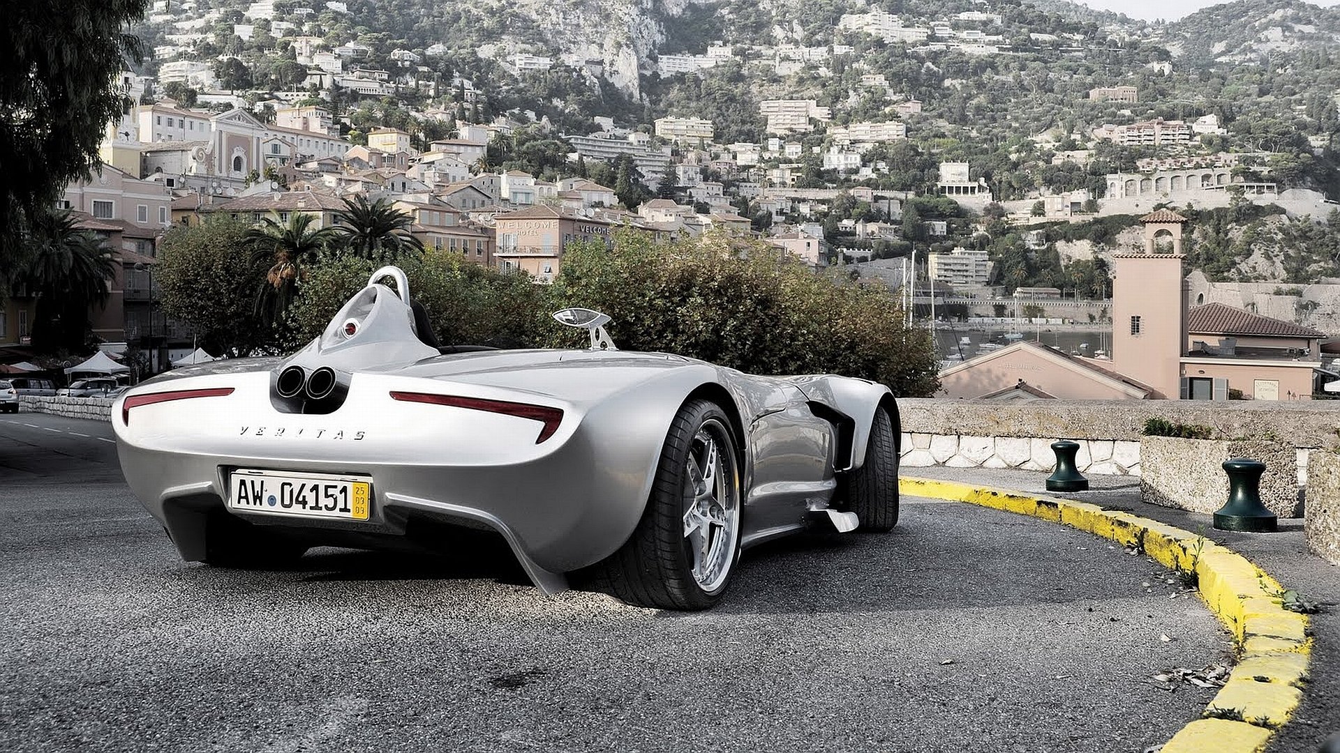Description: A silver sports car parked in a parking lot with a city in the background and a yellow line painted on the road.