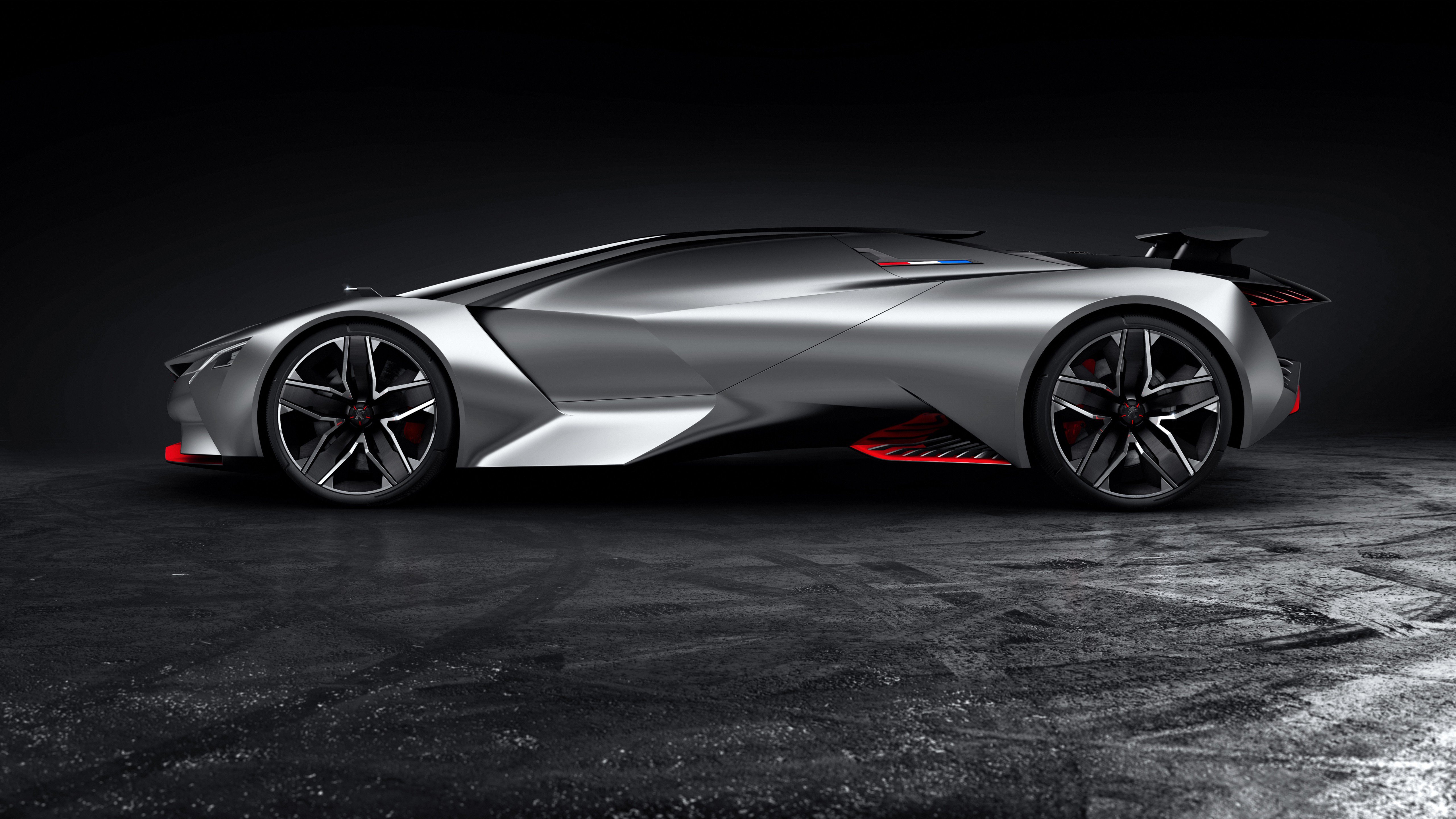 Description: A silver sports car is shown in a dark room with a black background and a red light on the side.