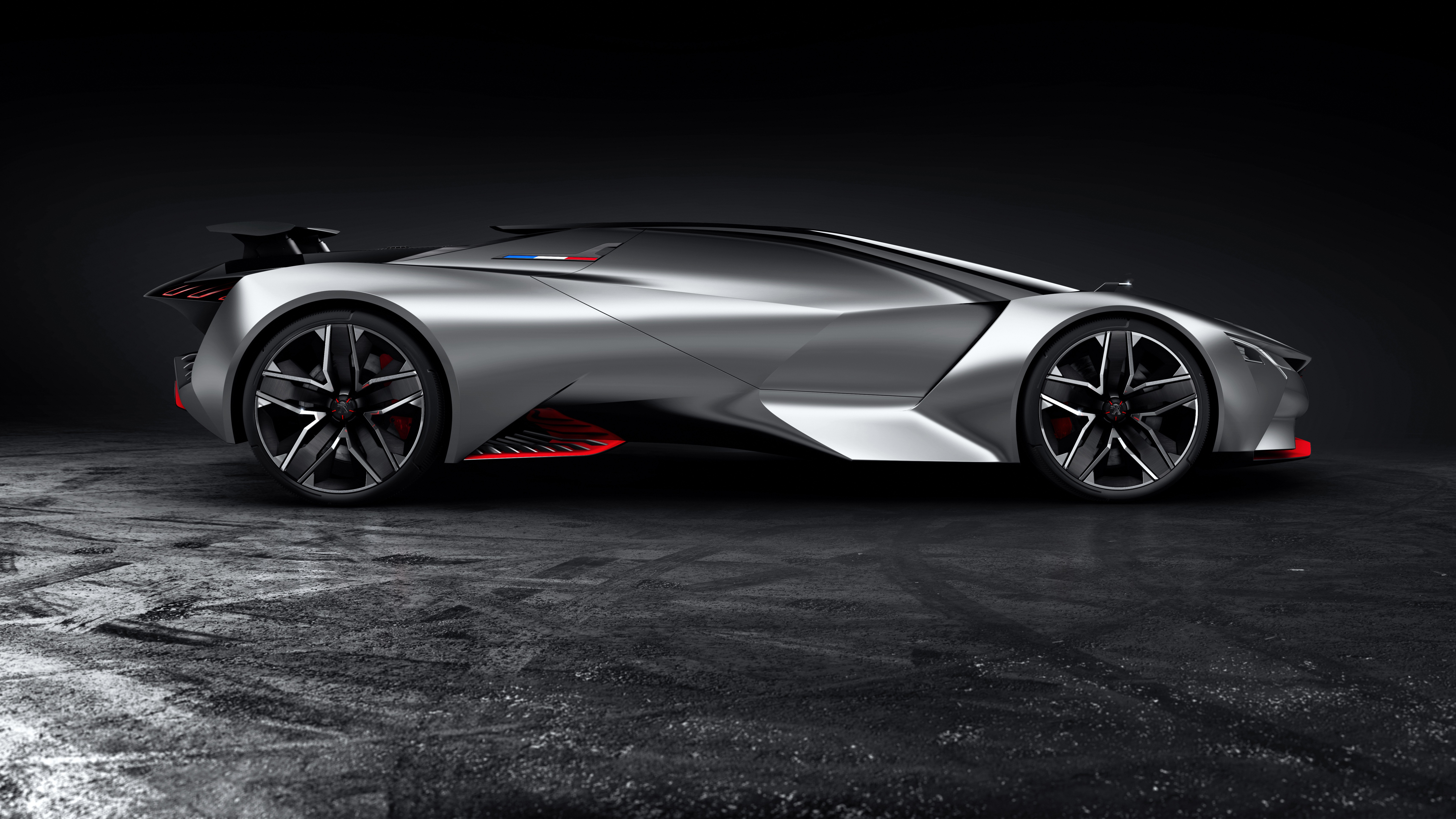 Description: A silver sports car is shown in a dark room with a black background and a red stripe on the side.