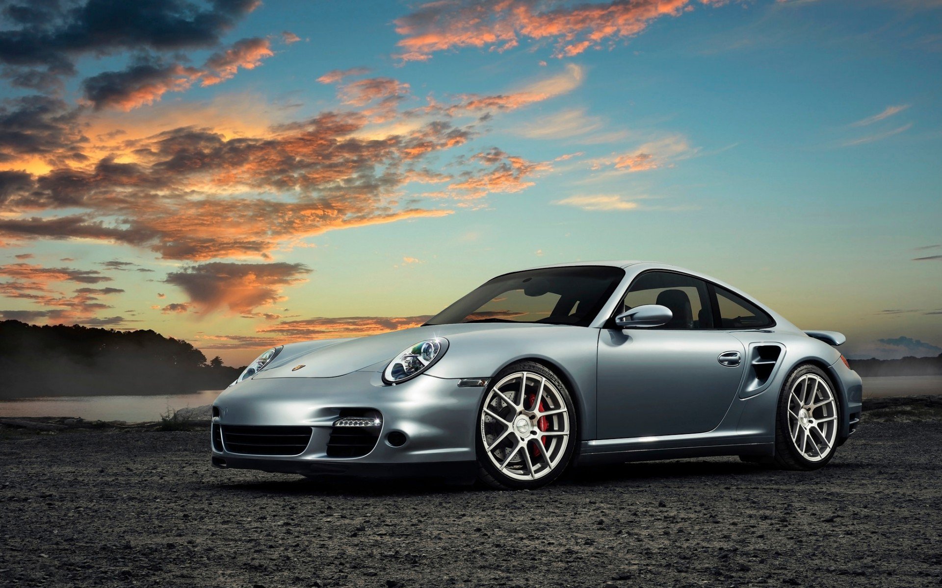 Description: A silver sports car parked on a dirt road at sunset with clouds in the background and a body of water in the foreground.