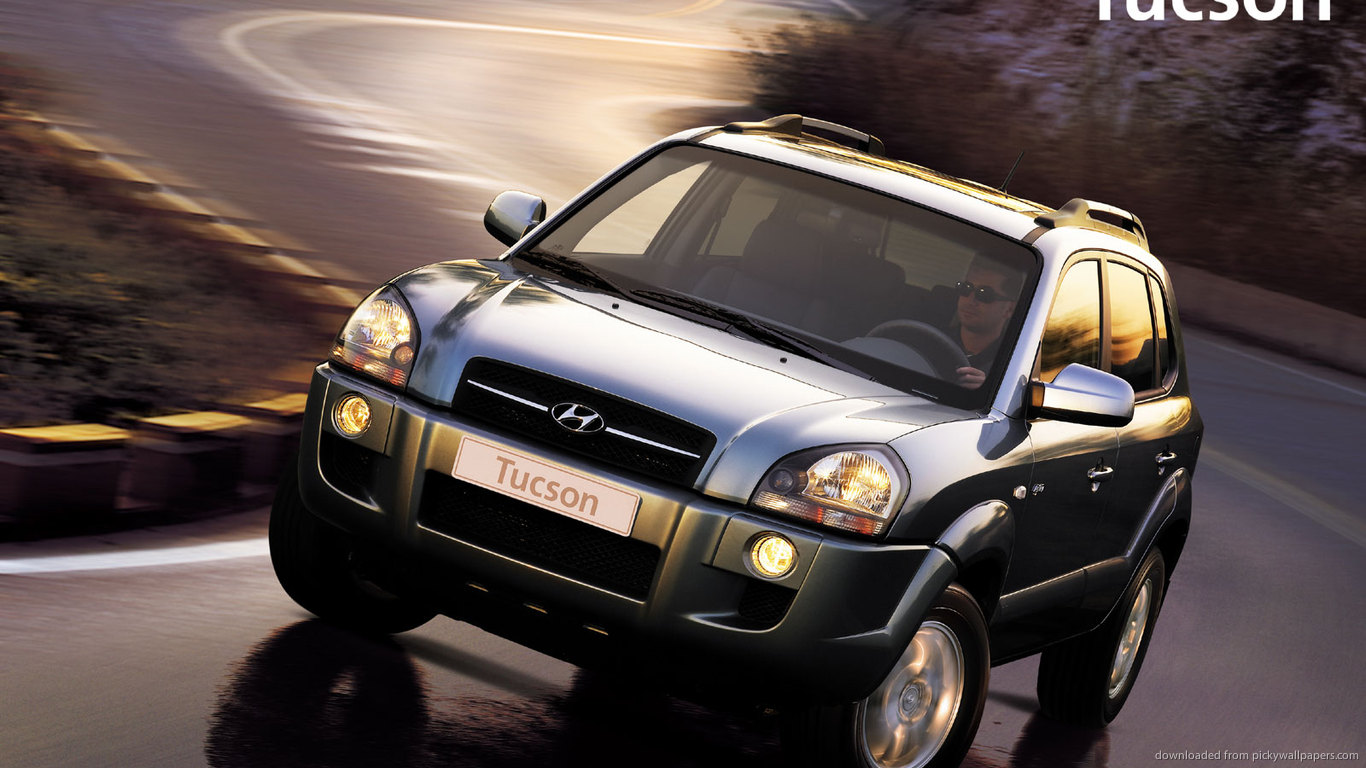 Description: A silver suv driving down a road next to a forest and a hill side with a person in the front seat.
