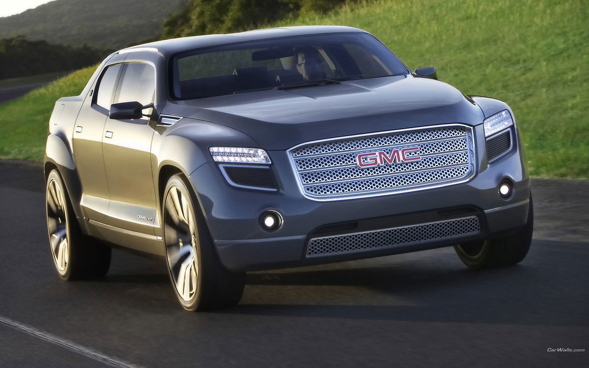 Description: A silver truck driving down a road next to a lush green hillside with trees on top of it and a hill in the background.