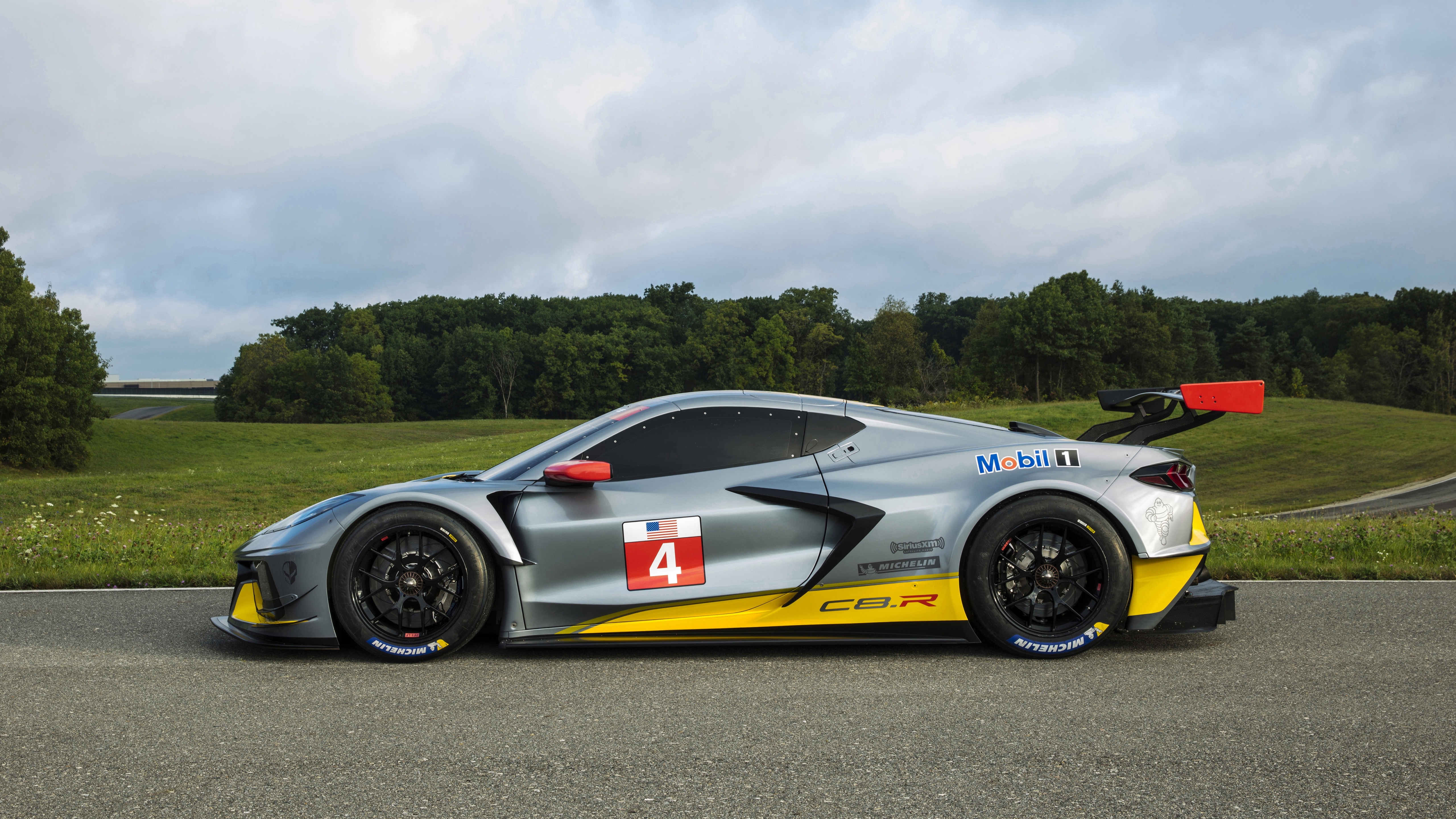 Description: A silver and yellow race car driving down a road next to a lush green field and forest on a cloudy day.
