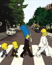 Description: A cartoon of the simpsons crossing the street with people walking across the street in the background and a car driving by.