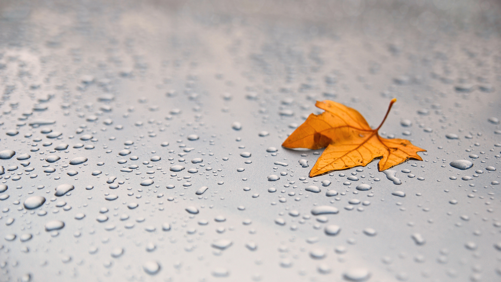 Description: A single leaf is laying on a wet surface with water droplets on it.