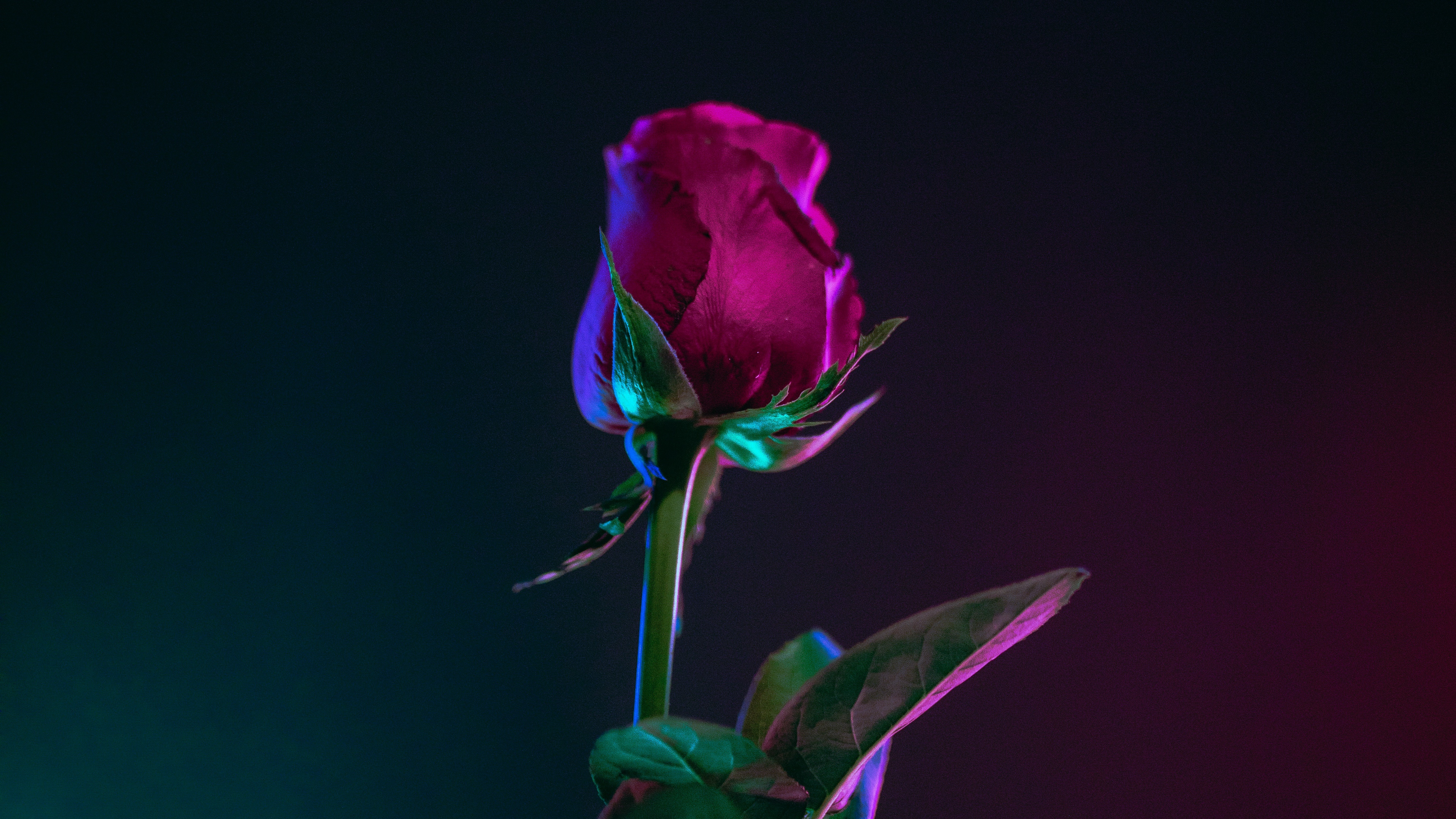 Description: A single rose is in a vase with a purple background and a green stem with a pink center and a green stem with a green stem.