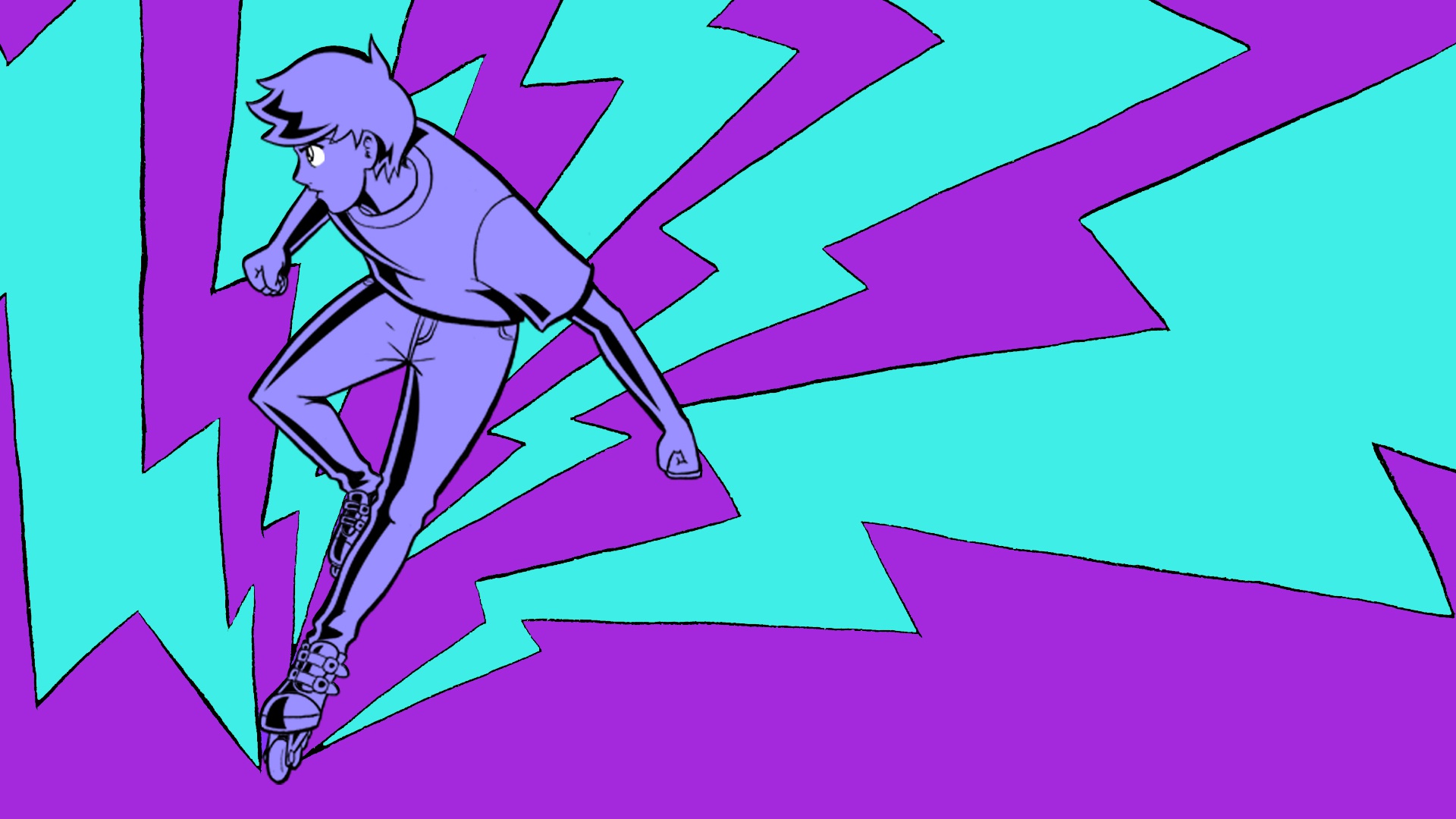 Description: A man riding a skateboard on a purple and blue background with a splash of paint behind him and a blue and purple background with a blue design.
