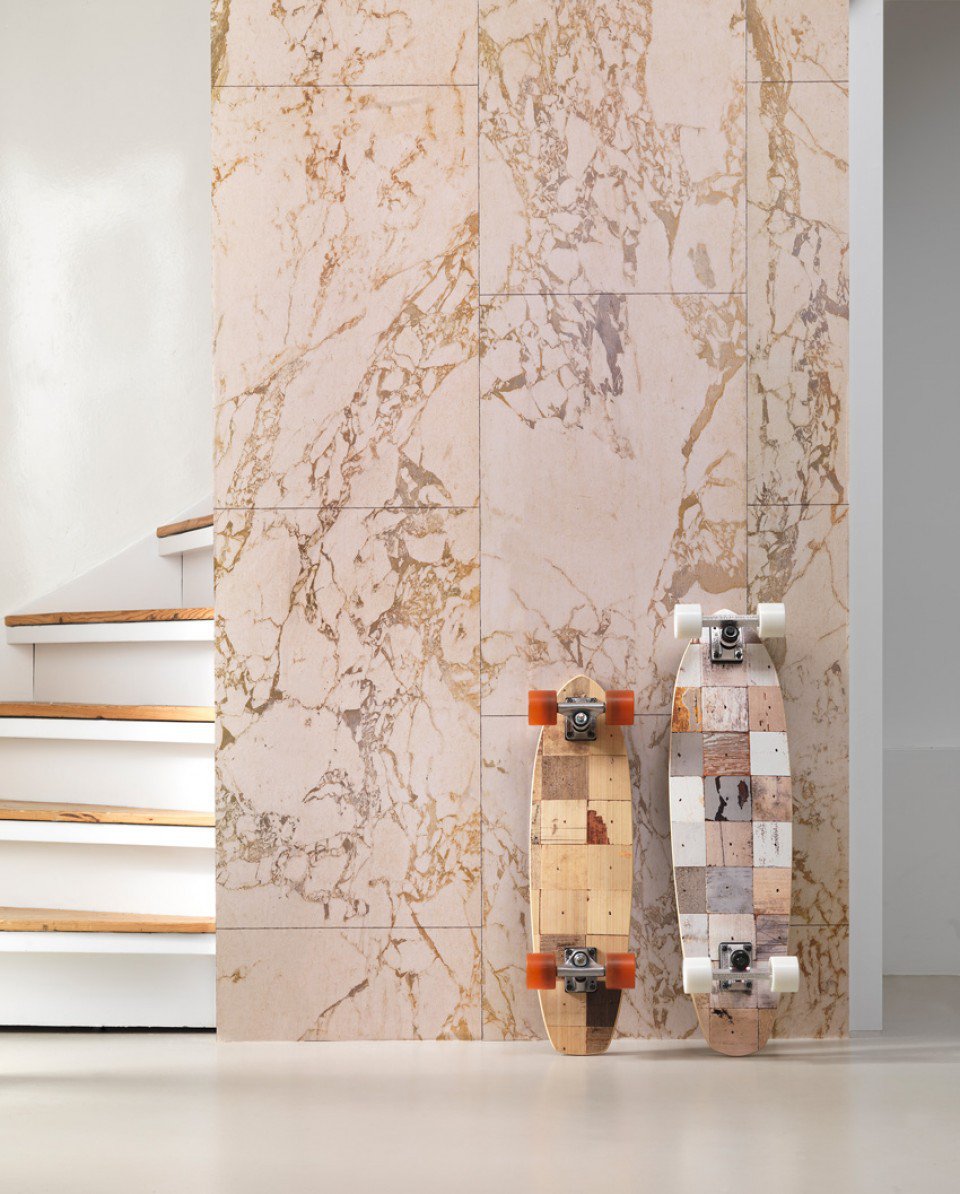 Description: Two skateboards are sitting on the floor next to a stair case in a room with marble walls and flooring.