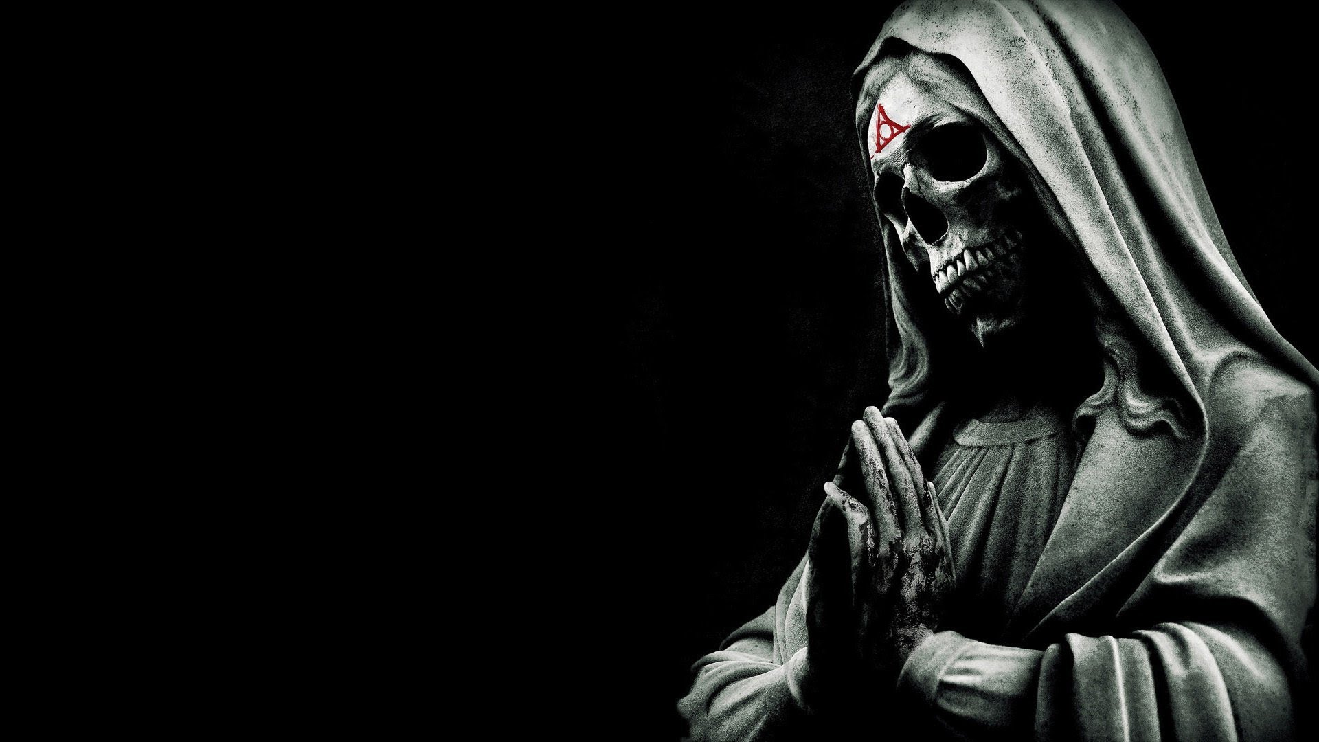 Description: A skeleton with a hood and a cross on it's face is shown in black and white.