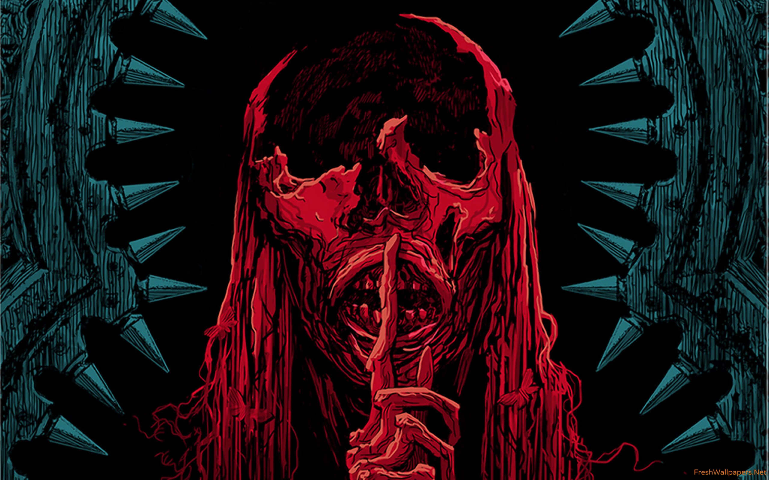 Description: A poster of a skeleton holding a knife in its mouth with a demon face on it's forehead.