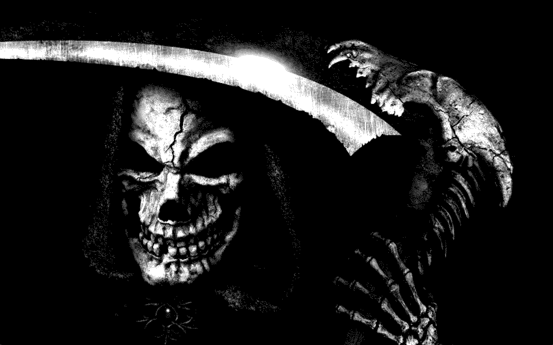 Description: A skeleton with a knife and a skull face on it's head and a knife in his hand.