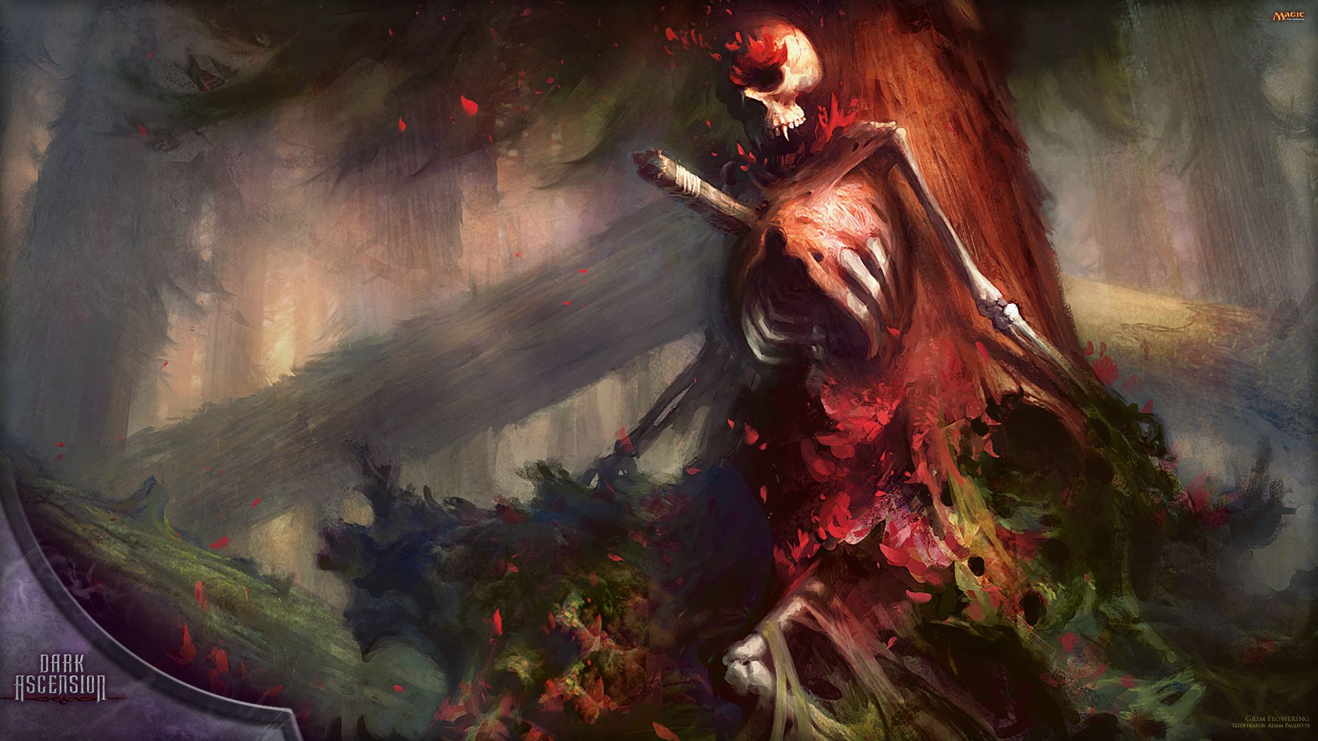 Description: A skeleton holding a sword in a forest with a tree in the background and a man in a red robe.
