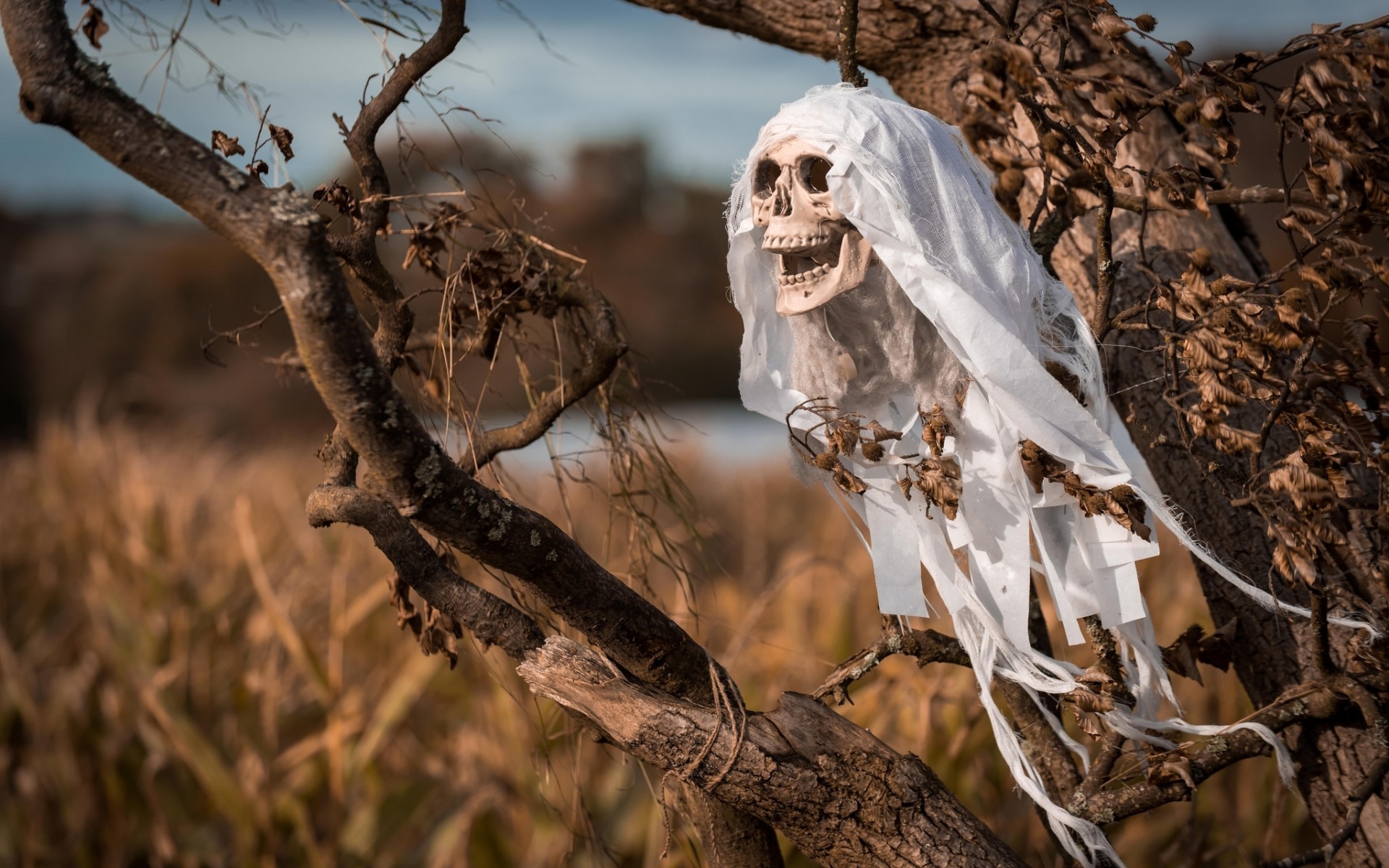 Description: A skeleton in a white veil on a tree branch with a field in the background and a sky in the background.