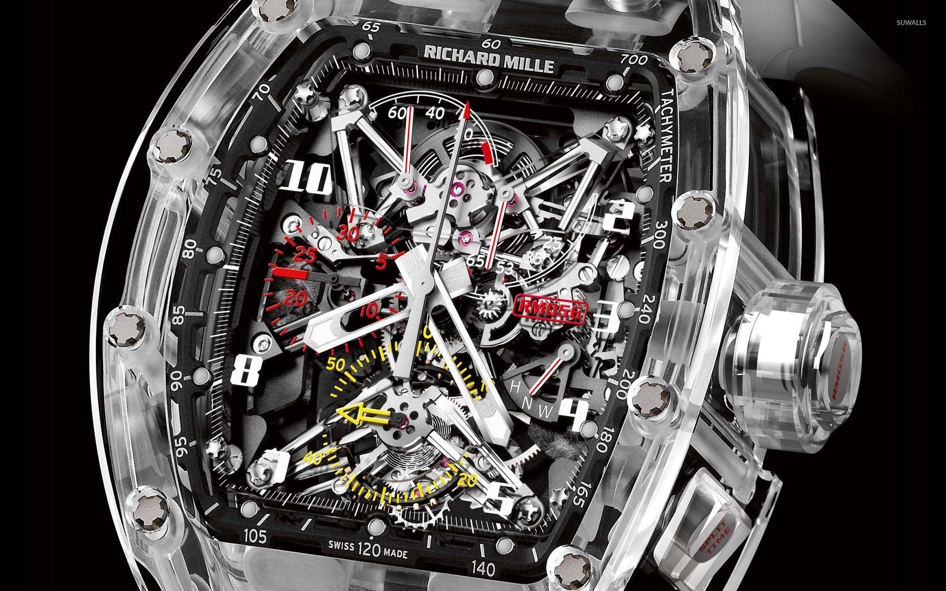 Description: A watch with a large skeleton face and a red and yellow clock face on it's face and a black background.