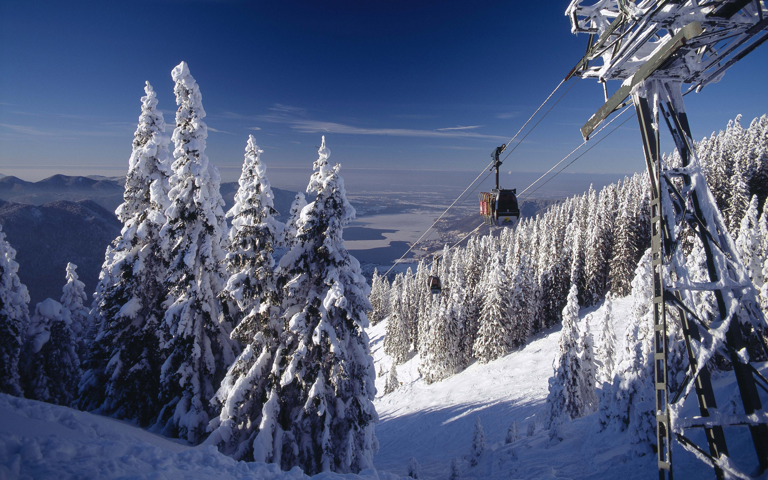 Description: A ski lift is going up a snowy mountain side with trees in the foreground and a blue sky above.