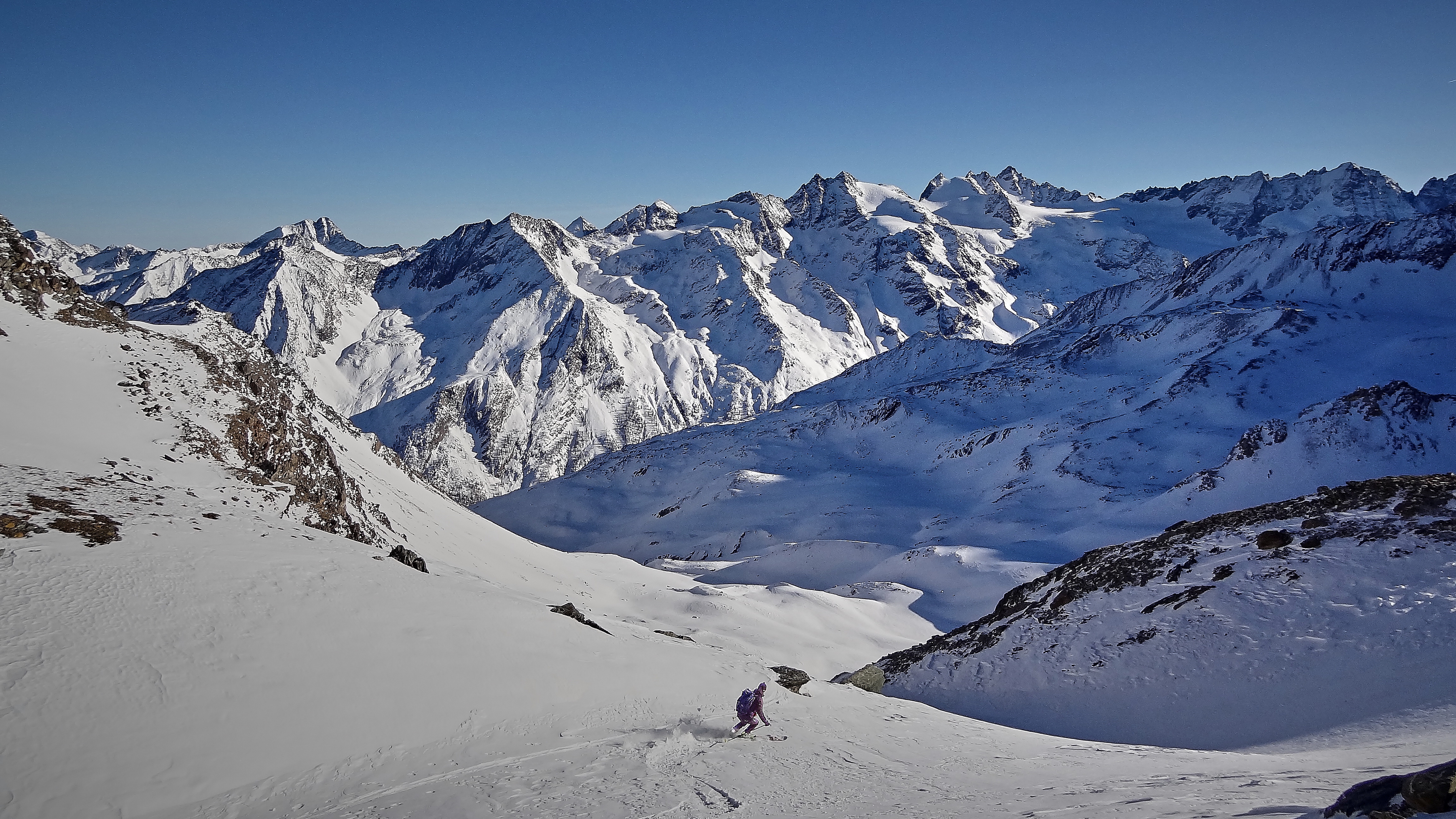 Description: A person skiing down a mountain with a lot of snow on it's sides and a mountain range in the background.