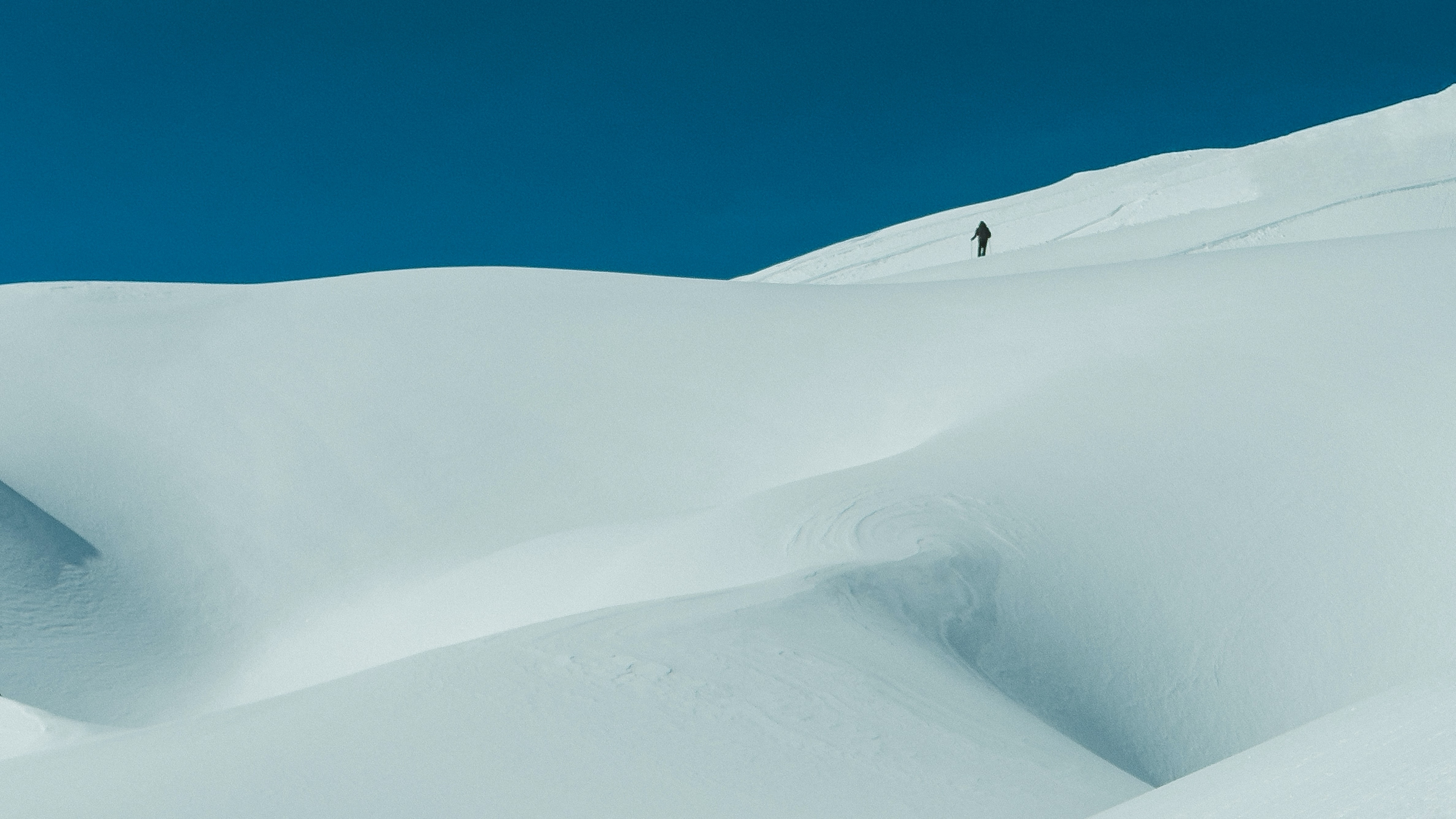 Description: A person skiing down a snow covered mountain side with a sky background and a blue sky in the background.