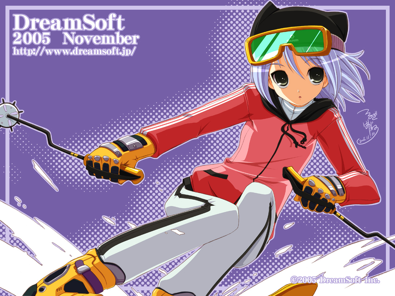 Description: A cartoon of a woman skiing down a hill with skis on her feet and a helmet on her head.