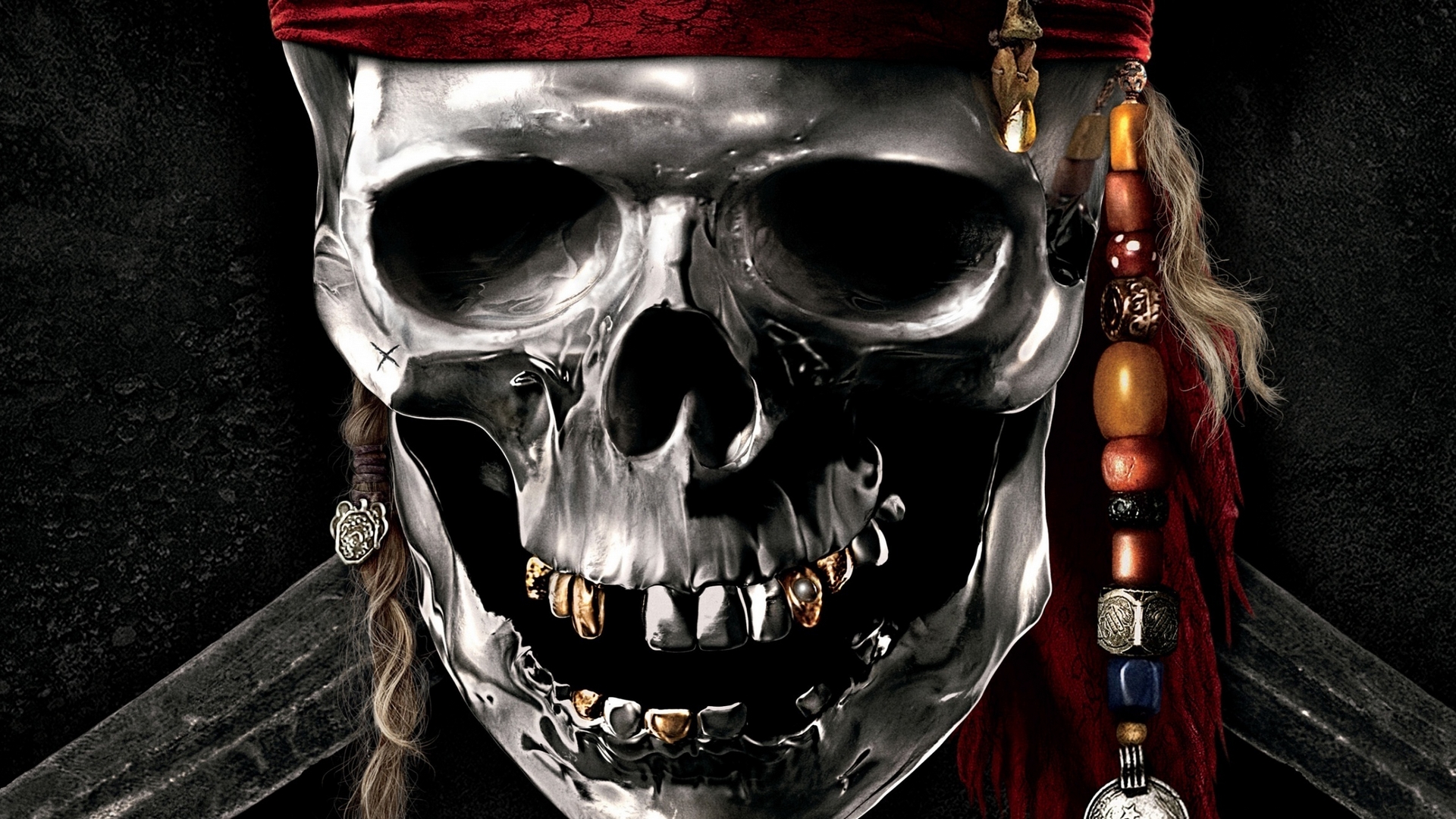Description: A skull with a red bandanna and a sword in its mouth and a red hat on top of it.