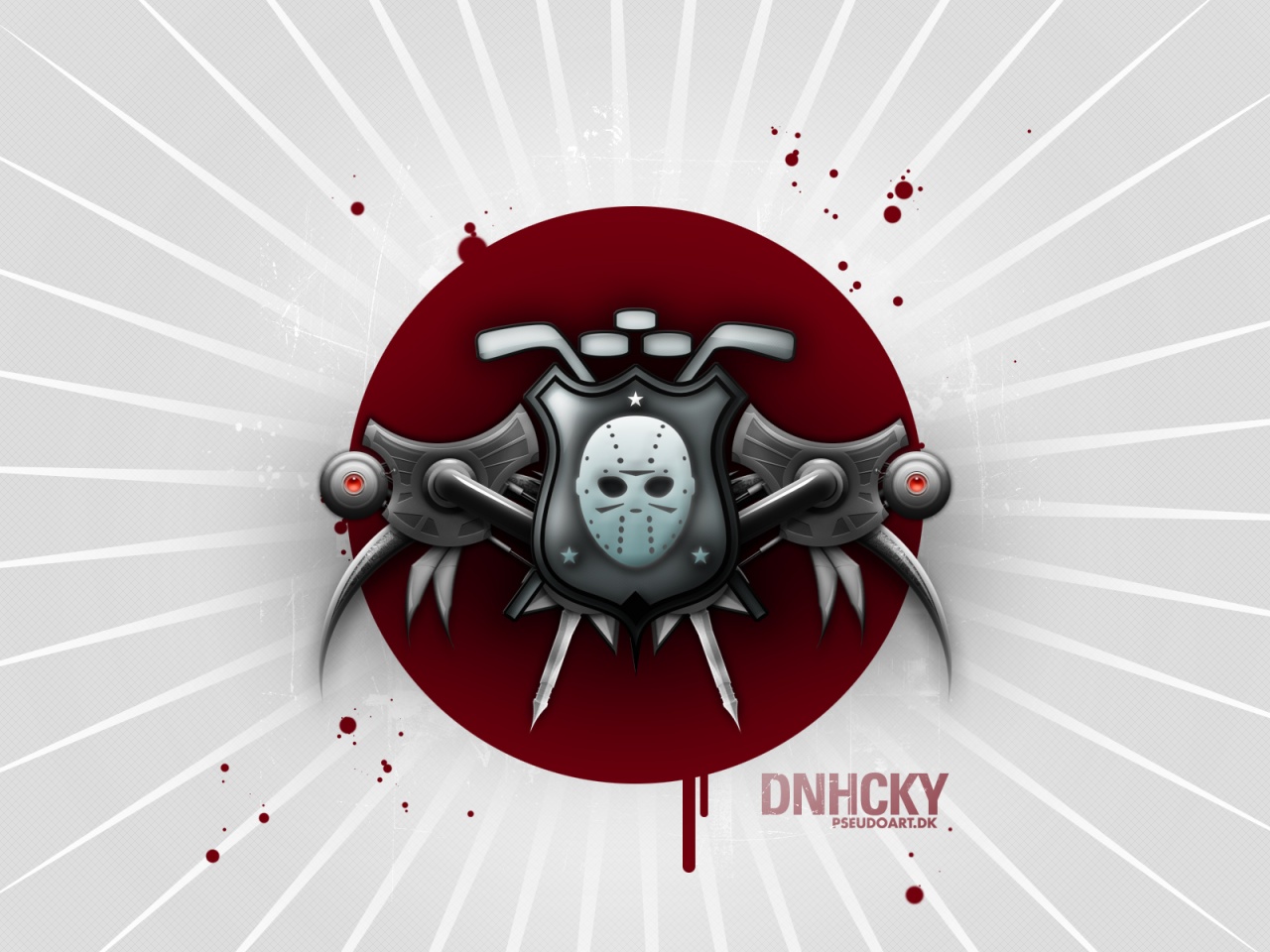 Description: A stylized image of a skull with two claws on it's face and a bloody background with a red circle.
