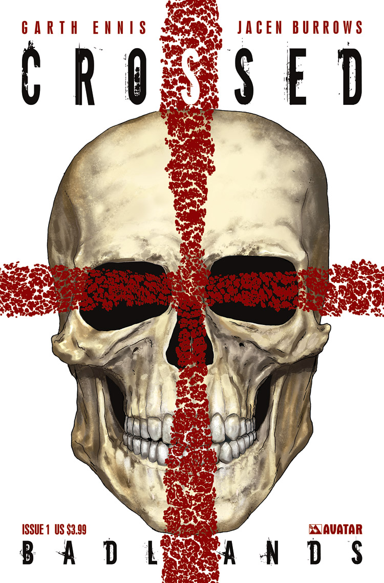 Description: A poster of a cross between a skull and a cross on a white background with red lines in the middle.