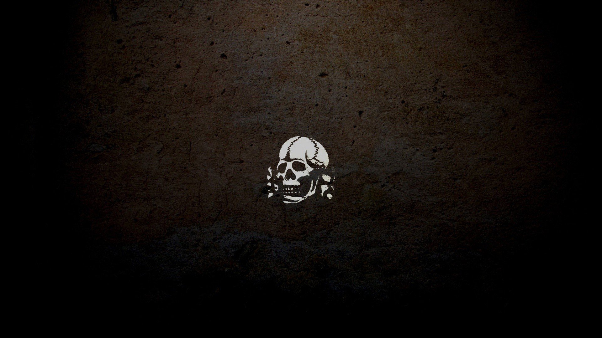 Description: A skull with a crossbone on it is shown in the dark room of a building with a light on.