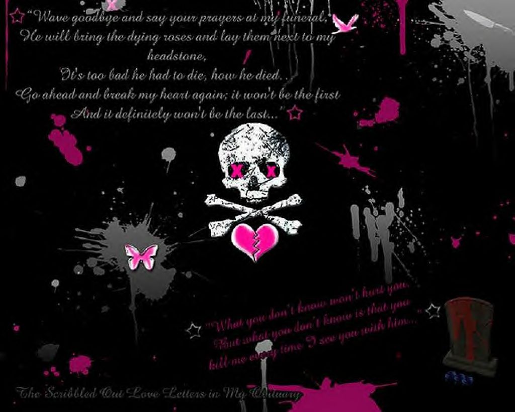 Description: A skull and crossbones with a pink heart on it's chest and a poem written in the middle.