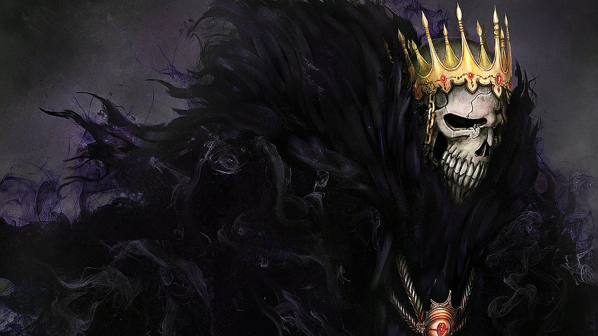 Description: A skull with a crown on its head and a black robe with a red light on it's chest.