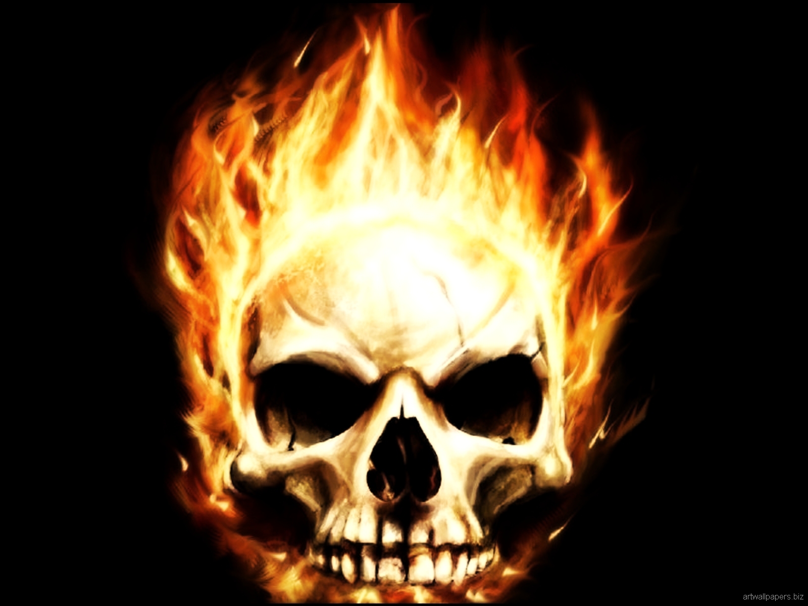 Description: A skull with a flame on its face is shown in the dark background of this image.