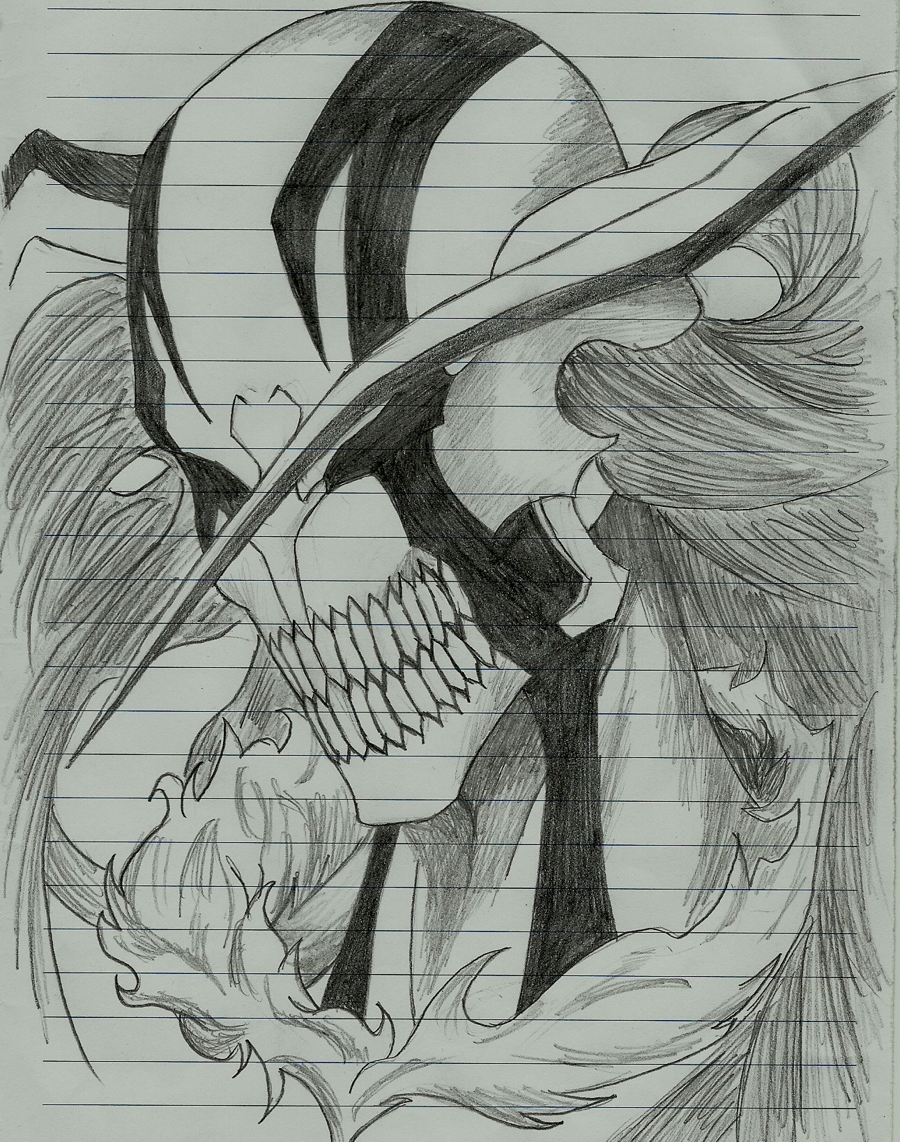 Description: A drawing of a skull wearing a hat and a feathered tail with a skull in the middle of the drawing.