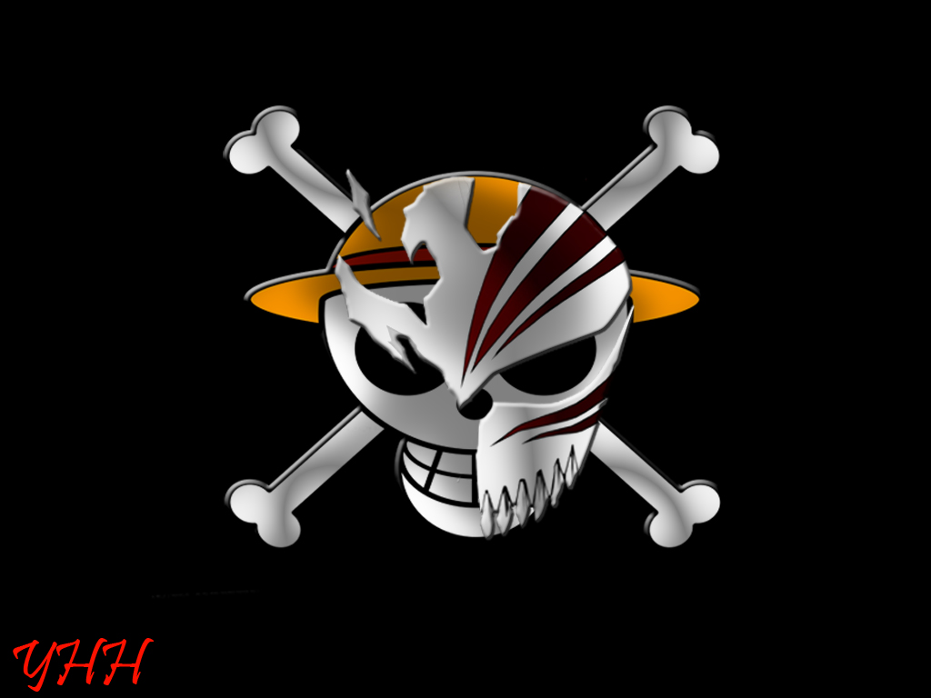 Description: A skull with a hat and two swords on it's head and a pirate flag on its forehead.