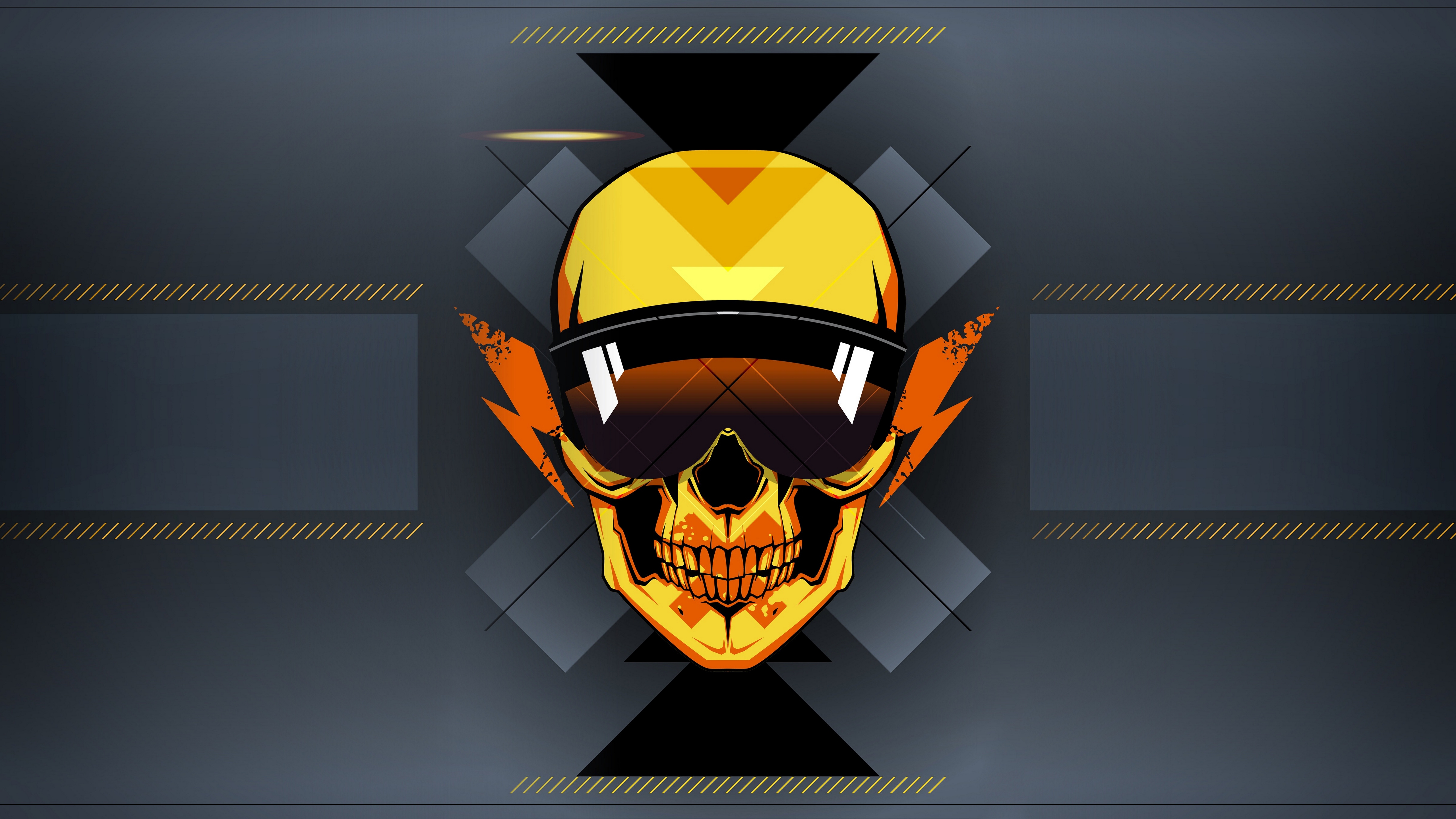 Description: A skull wearing a helmet with a yellow flame on it's face and a black background with a yellow triangle.