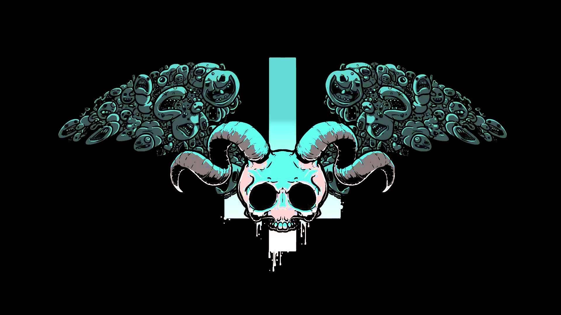 Description: A skull with a large horn and a large bird on it's head.