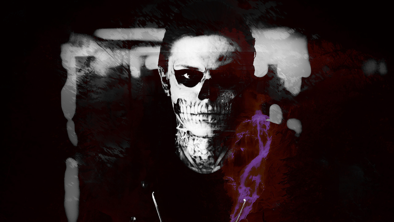 Description: A man with a skull face and a purple tie on his neck and a black background with a white skull.