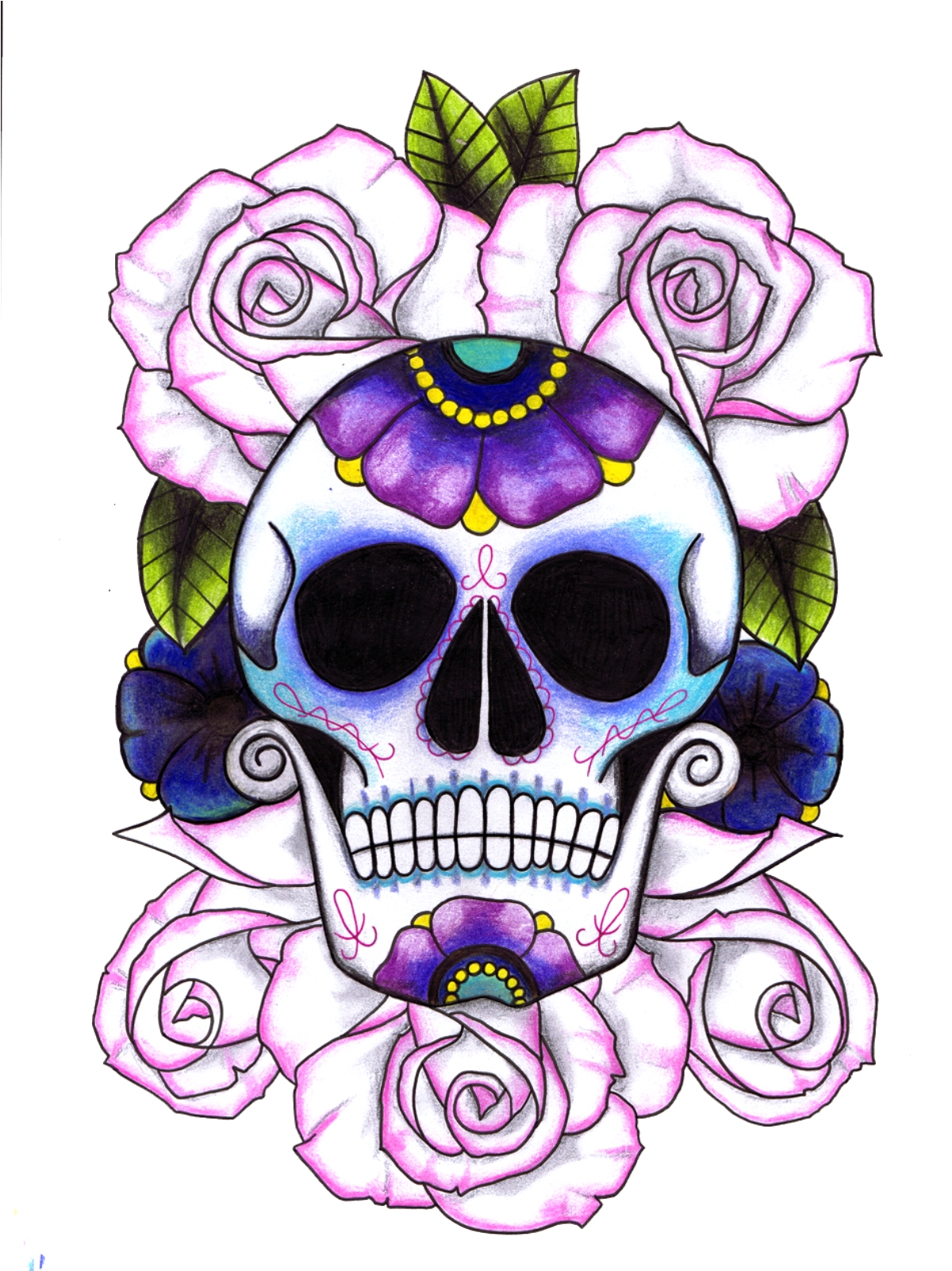 Description: A drawing of a skull with roses on it's head and a ring around its neck.