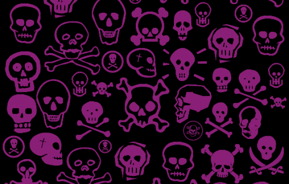 Description: A bunch of skulls and bones on a black background with purple ink on the bottom of the image and the bottom of the image.